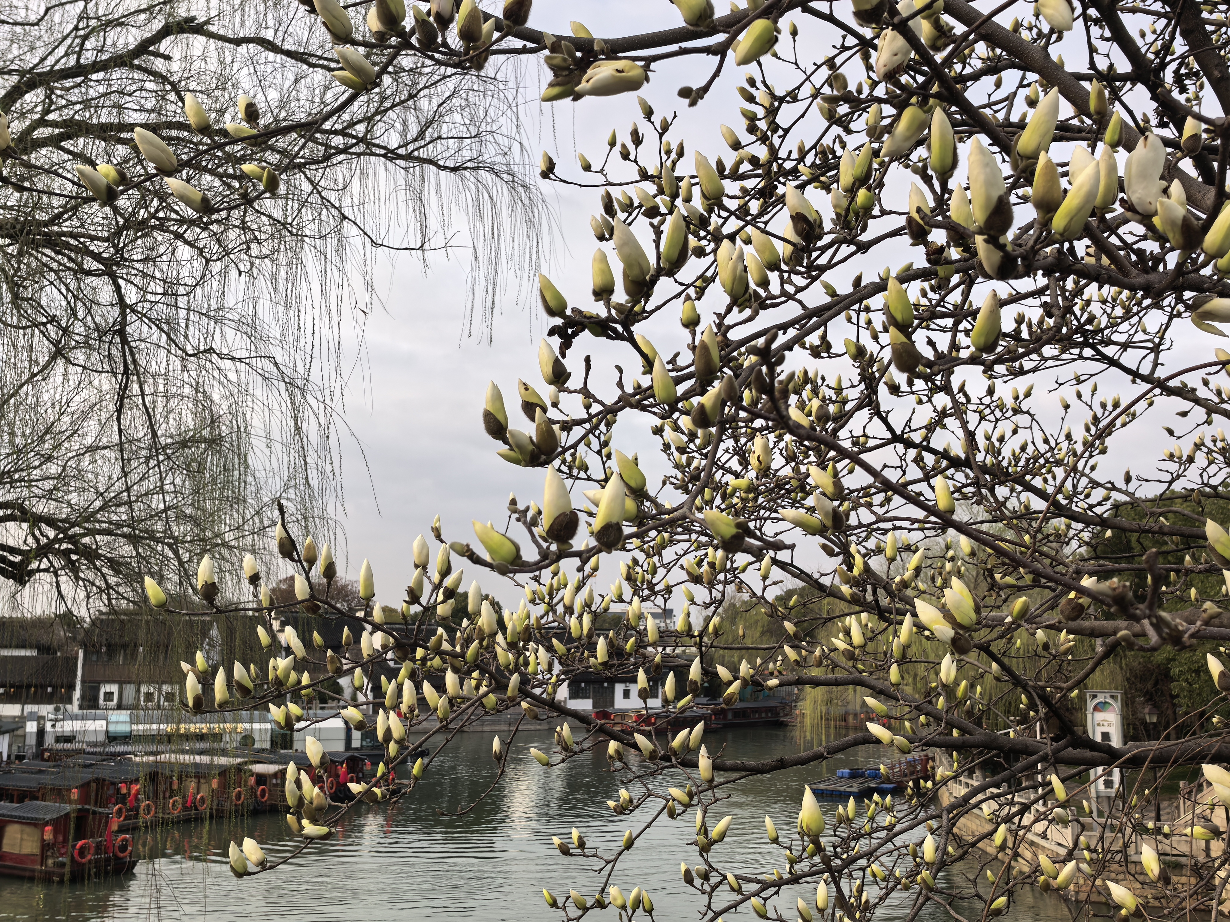 走进山塘街,天近傍晚。脚下是温润的青石板,身旁是缓缓流淌的河水,白墙黛瓦依水而建,小桥横跨两岸,一步一景皆是江南独有的情调。河边的柳枝刚刚发芽、玉兰含苞待放,早春的气息在水边轻轻弥漫。许多穿着汉服的年轻人穿梭其间,偶尔看到老苏州人坐在河边喝茶聊天。一古一今,一动一静,这里没有过度的喧嚣,倒更像是一幅粉墙黛瓦、小桥流水的江南水墨长卷。