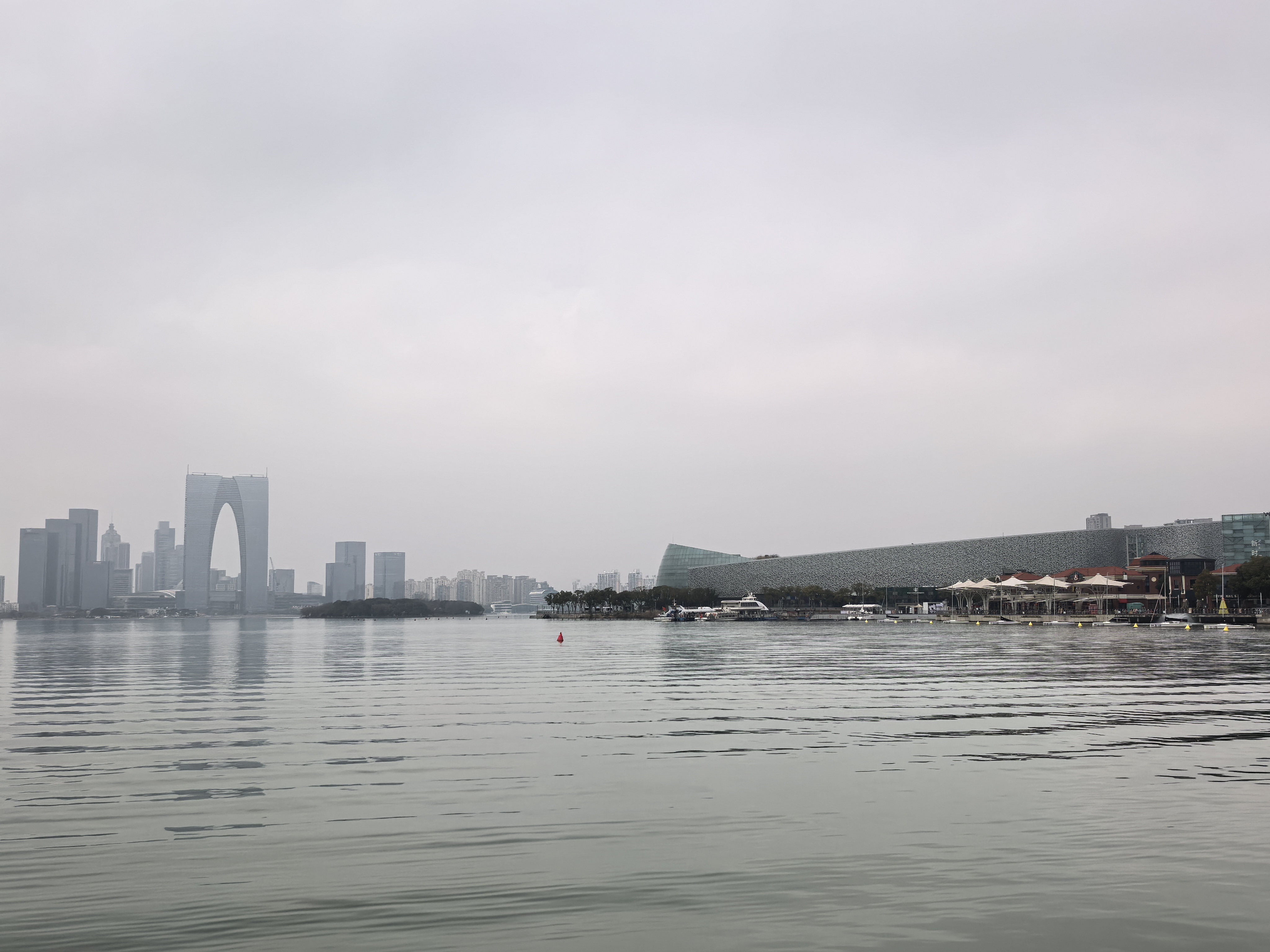 在市区吃了一碗苏式面,便从晨雾未散的姑苏城出发,一路向东,来到金鸡湖畔。褪去老城区粉墙黛瓦的婉约,园区的现代气息随晨光渐浓。此刻的金鸡湖安静得像一幅晕染的水墨,远处的楼宇在薄雾中若隐若现,这份清晨独有的静谧,仿佛与这片湖水达成了无声的共鸣。
