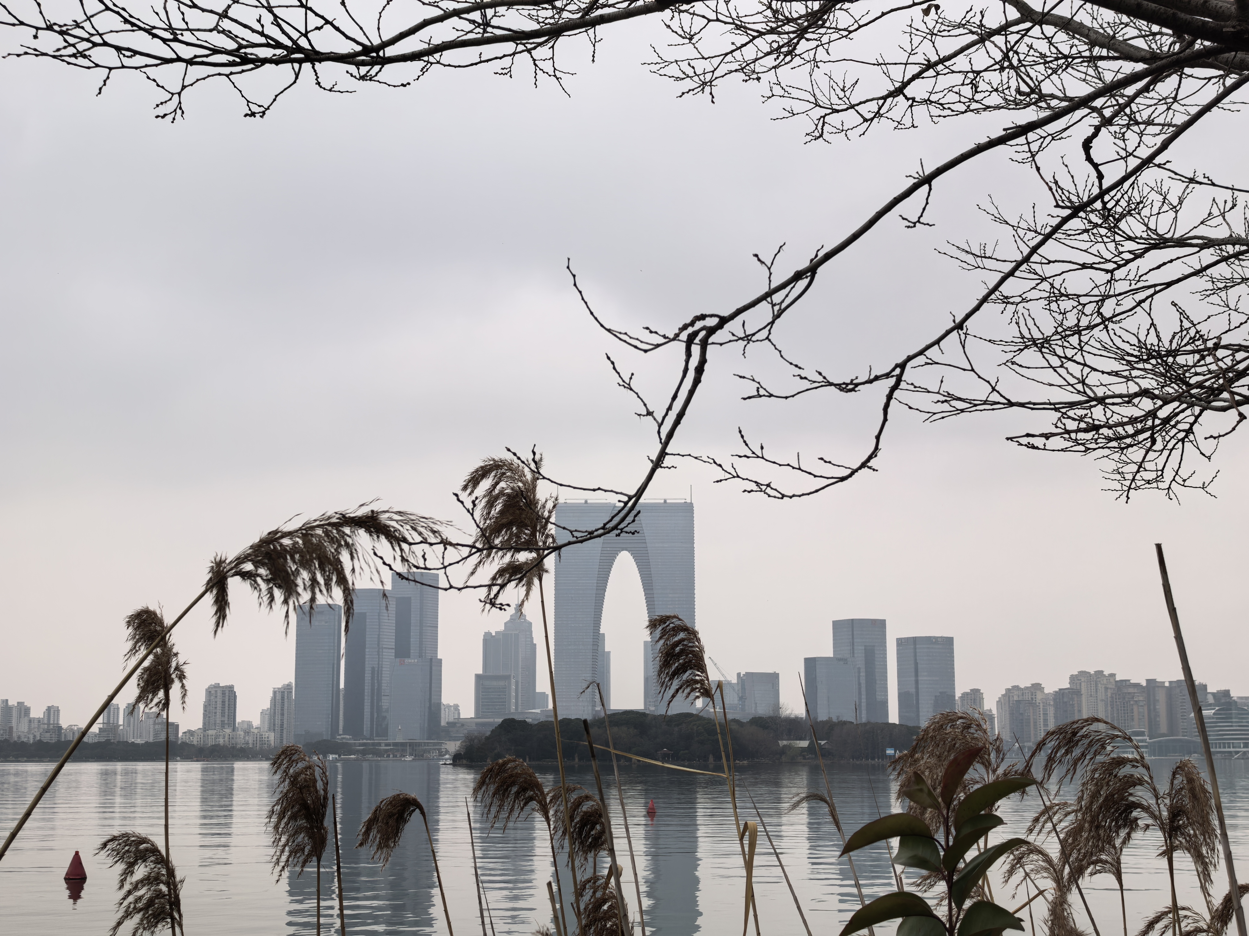 沿着湖岸,最先闯入视野的是东方之门。这座被戏称为“大裤衩”的地标建筑,在晨光中显得格外挺拔,利落的线条勾勒出独特的门形轮廓,玻璃幕墙反射着湖面的波光与天空的颜色,既有现代建筑的磅礴气势,又暗合了江南水乡的通透质感。站在它脚下,仰望其凌空舒展的姿态,既能感受到苏州与时俱进的开放与先锋,也能体会到这座城市在传承中创新的底气。