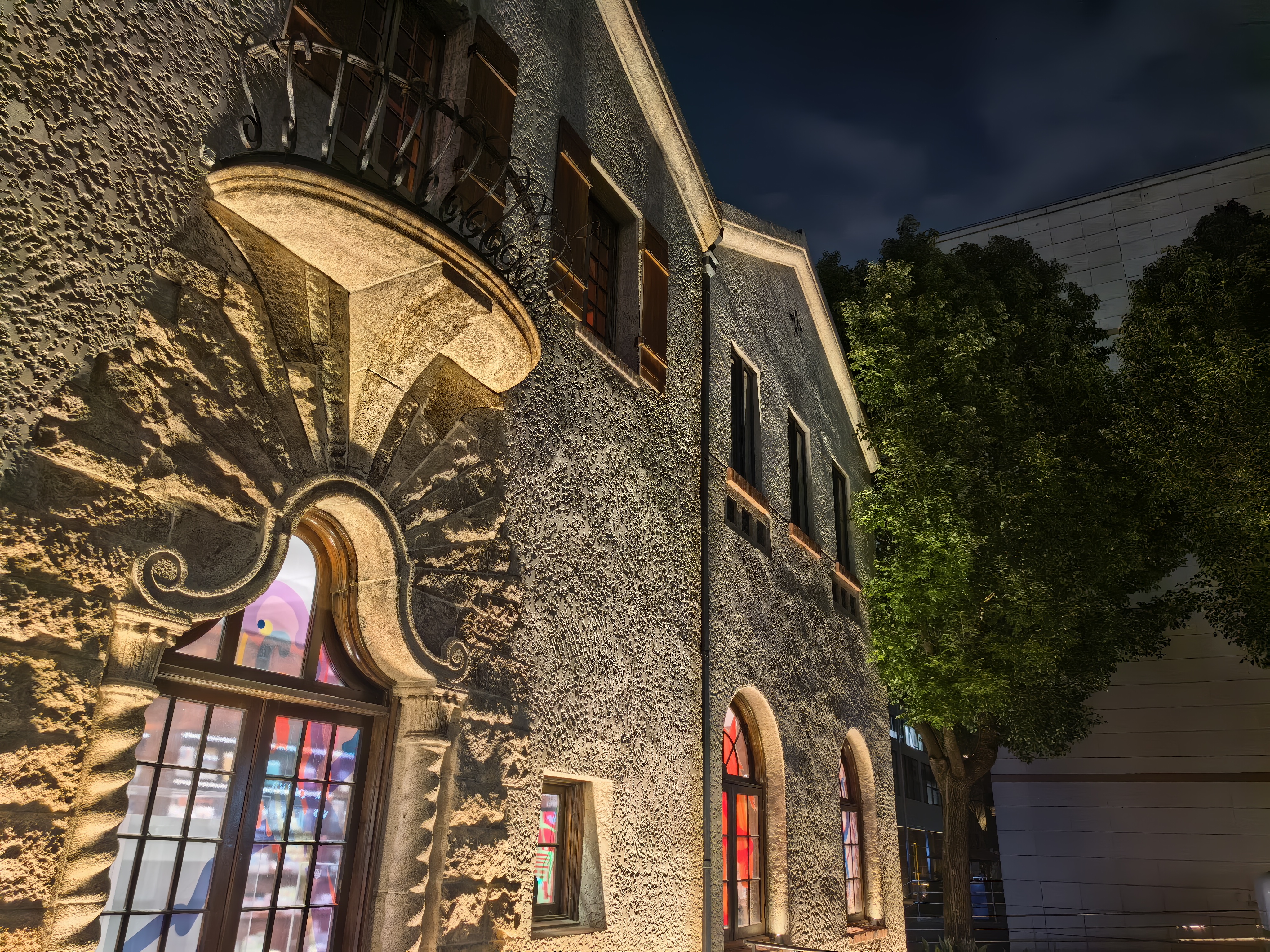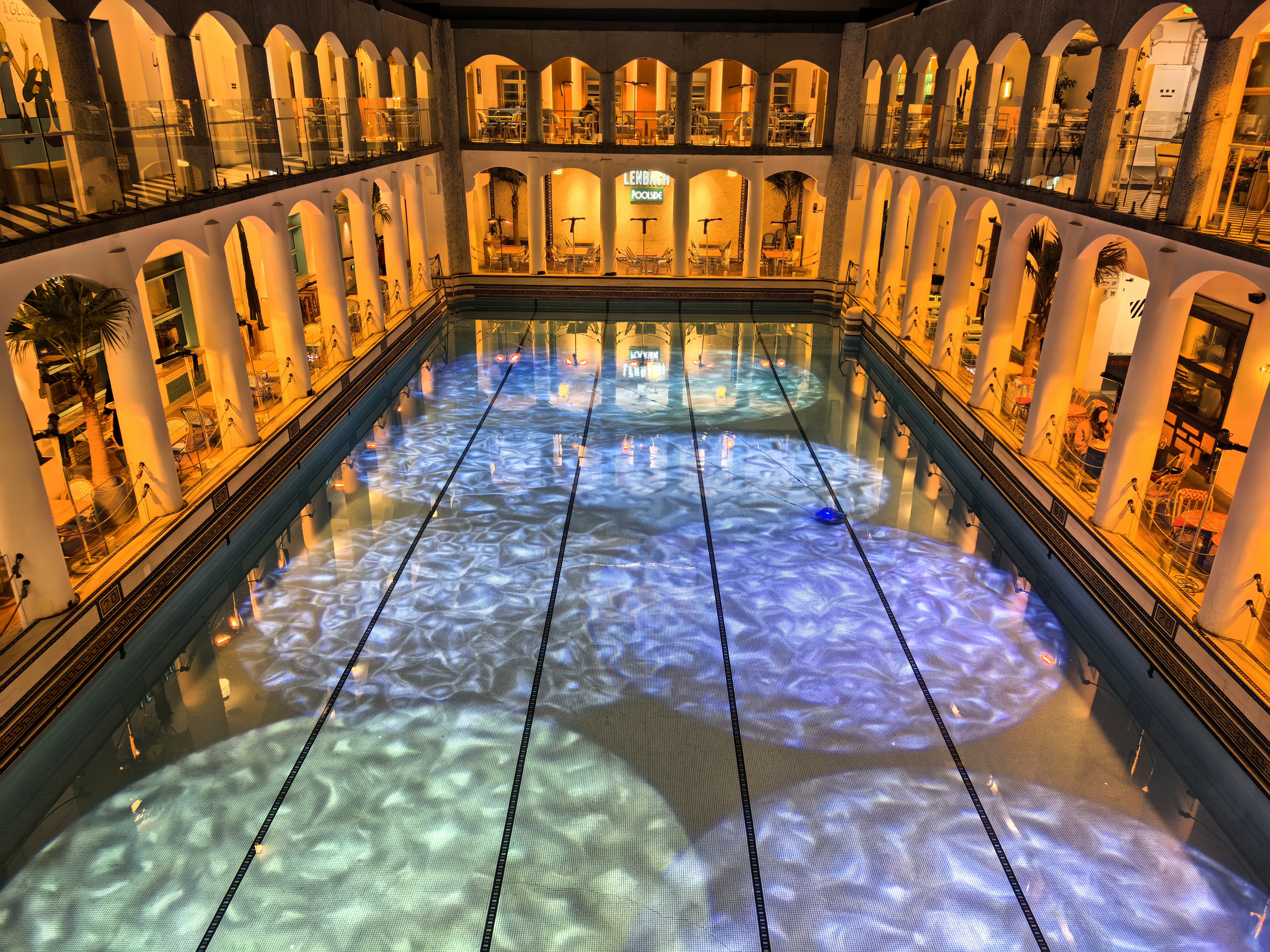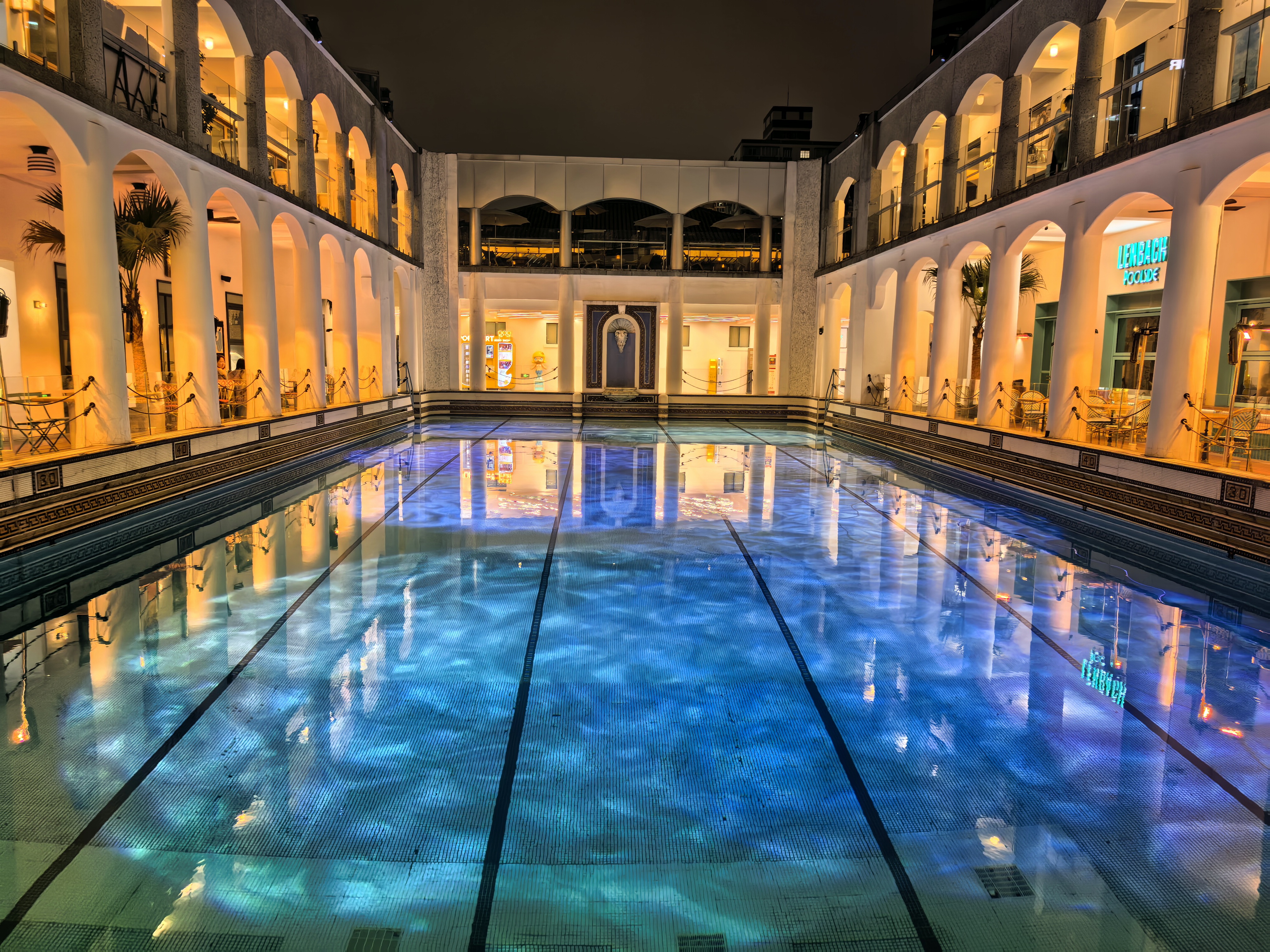 暮色降临,上生·新所褪去白日的喧嚣,换上静谧又浪漫的外衣。暖黄灯光温柔地洒在邬达克设计的孙科别墅、海军俱乐部的复古拱廊上,雕花窗棂与木质地板在夜色里更显温润,百年历史的厚重感扑面而来。那座声名在外的泳池也在夜色中别有韵味——蒂芙尼蓝池水与灯光交相辉映,马赛克瓷砖泛着柔和光泽,白色廊架勾勒出优雅轮廓,让人仿佛置身欧式秘境。随手拍了几幅照片,张张都是氛围感十足。