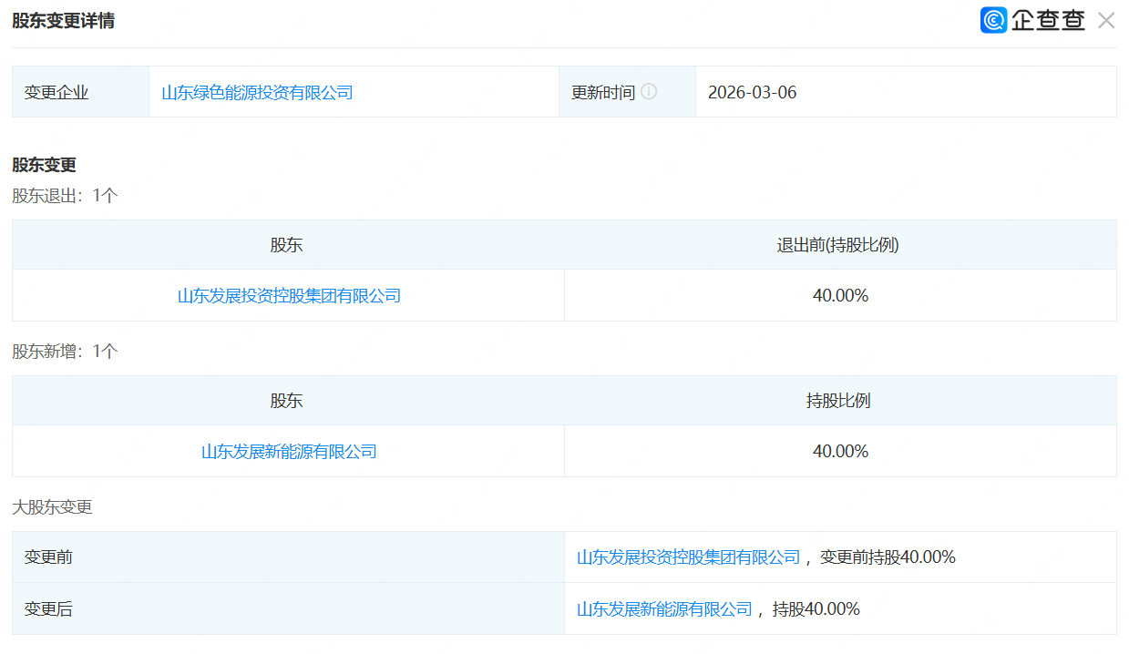 近日,企查查工商信息显示,山东绿色能源投资有限公司(下称“山东绿色能源投资”)大股东发生变更,原持股比例40%的山东发展投资控股集团有限公司 (下称“山东发展集团”)退出,其全资子公司山东发展新能源有限公司新增入股,持股比例40%。