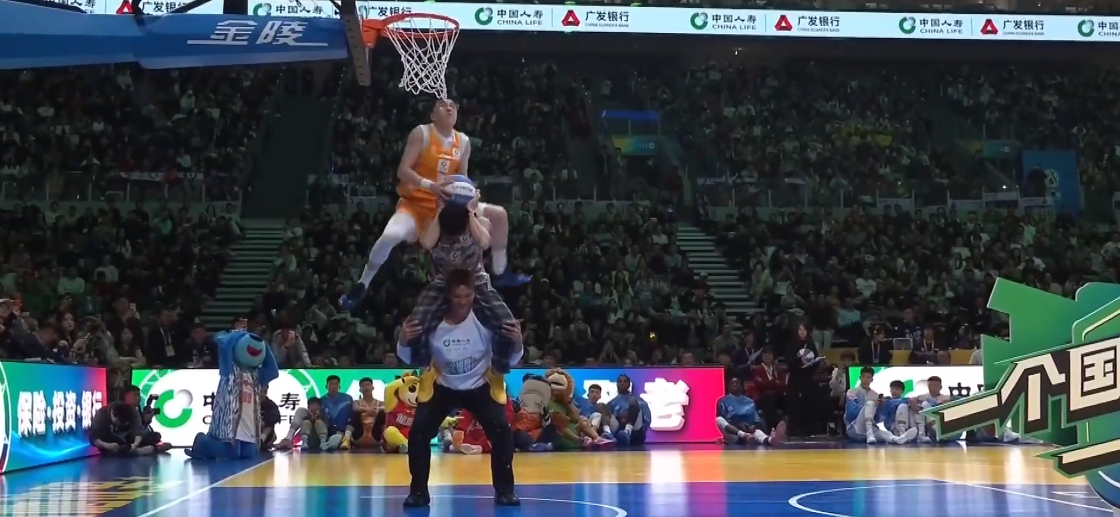 扣篮大赛最后一个亮相,刘礼嘉、外卡球员张鼎岩、余泽辰参加。第一个出场的是刘礼嘉,第一个扣篮拿到41分,第二个扣篮拿到41分,总分82分。第二个出场的是张鼎岩(外卡球员),他第一扣飞跃叠罗汉的两人,用平筐反扣拿到50分;第二扣表演“蝎子摆尾”又拿50分。第三个出场的是俞泽辰,第一扣打侧沿空接反扣拿到50分,第二扣空接转体再拿50分,和张鼎岩进入加赛。