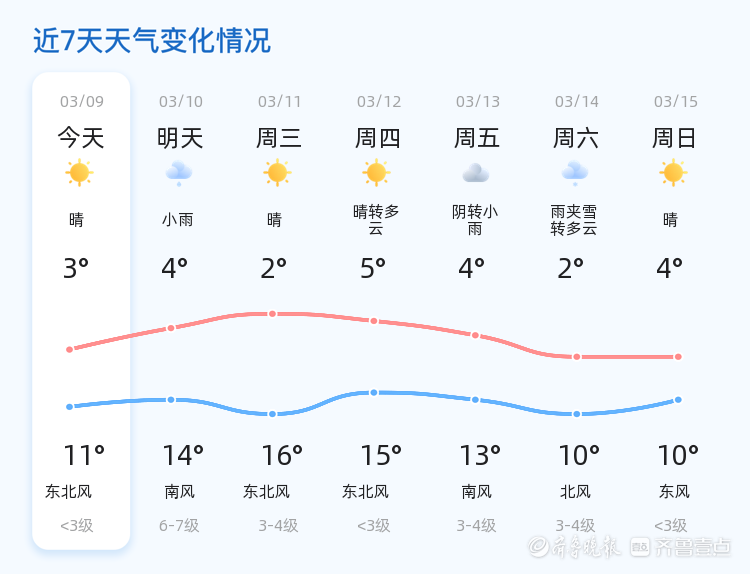 今天是3月9日,星期一,农历正月廿一。聊城市的天气以晴朗为主,气温较为适宜。目前气温为4.9℃,东北风2级,空气湿度76%,PM2.5指数为199,属于轻度污染。全市各区天气情况基本一致,均为晴朗天气,适合市民户外活动。预计今日最高气温可达11℃,最低气温为3℃。
