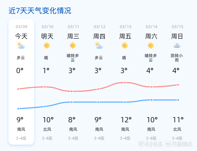今天是3月9日,星期一,农历正月廿一。青岛市今天天气多云转晴,北风3级,当前温度4℃,相对湿度72%,空气质量良好。各区天气情况基本一致,白天气温逐渐回升,市民出行需注意适时增减衣物。预计今天最高气温9℃,最低气温0℃。