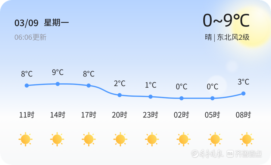 今日是3月9日,星期一,农历正月廿一。滨州地区天气晴朗,气温在0℃到9℃之间,东北风2级,空气湿度54%,PM2.5指数为128,属于轻度污染。市民出行时建议佩戴口罩,减少户外活动时间,以保护呼吸道健康。今天的天气适合外出活动,但请注意保暖,避免着凉。