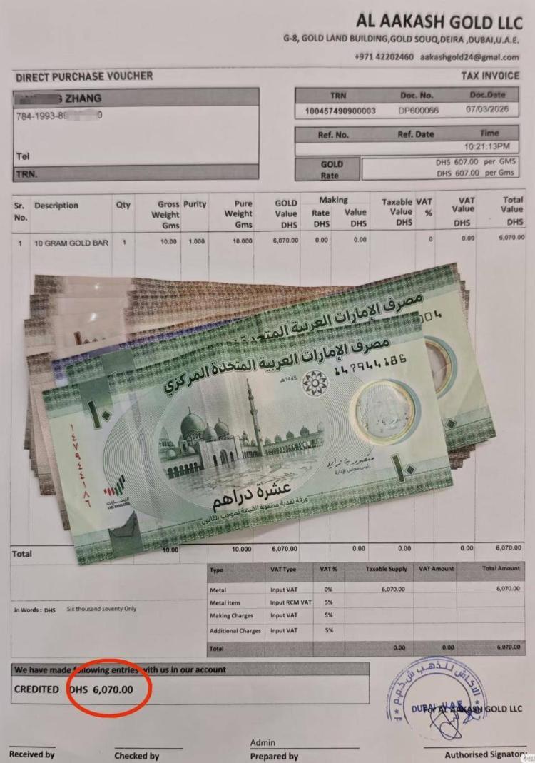 张先生拍下的图片显示,这件10克的金饰,他去年8月以总价4045迪拉姆购入,3月7日以6070迪拉姆卖掉。虽然这次卖黄金的价格(607迪拉姆/克)比同一天的黄金挂牌价格(623迪拉姆/克)略低,但比起去年购买时,他还是赚了2025迪拉姆(折合人民币约3802元)。“债券利率上来了,根本的东西发生改变了,难以再涨了。”在解释为何此时将黄金卖出时,张先生对记者说。