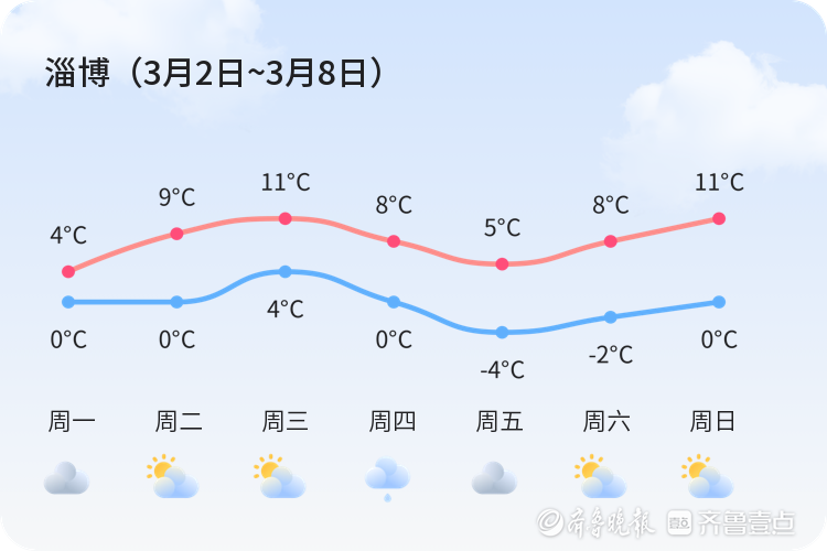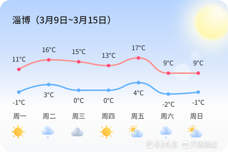 全市周平均最高温8℃,平均最低温0℃,平均气温3℃,周最高气温11℃,出现在周三、周日,周最低温-4℃,出现在周五。
