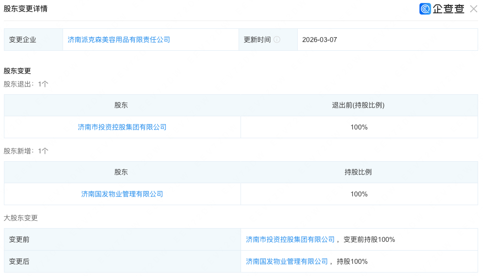 近日,济南派克森美容用品有限责任公司(下称“派克森”)股东发生变更,原全资股东济南市投资控股集团有限公司(下称“济南投资集团”)退出,由其全资子公司济南国发物业管理有限公司(下称“国发物业”)100%接盘。