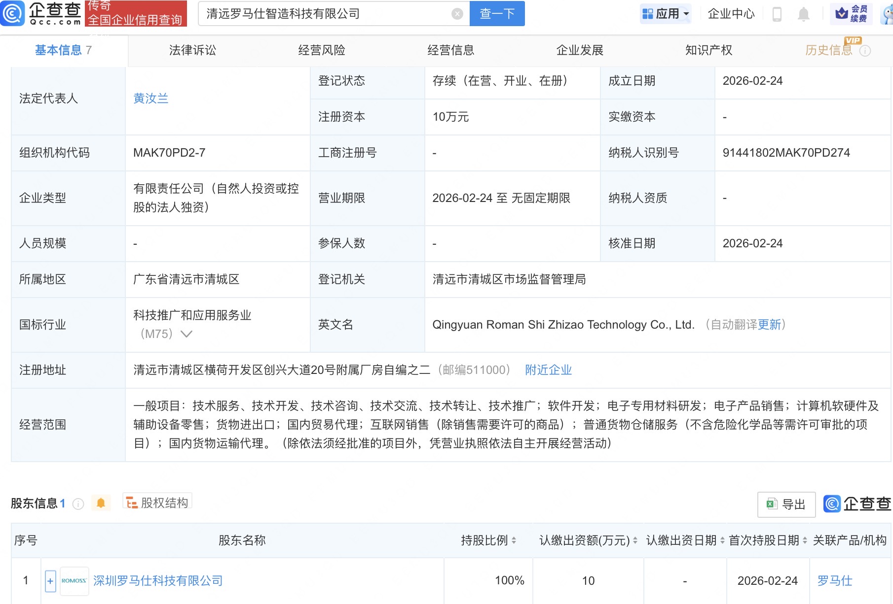 企查查APP显示,近日,清远罗马仕智造科技有限公司成立,法定代表人为黄汝兰,经营范围包含软件开发、电子专用材料研发、电子产品销售、计算机软硬件及辅助设备零售等,由深圳罗马仕科技有限公司全资持股。(企查查)