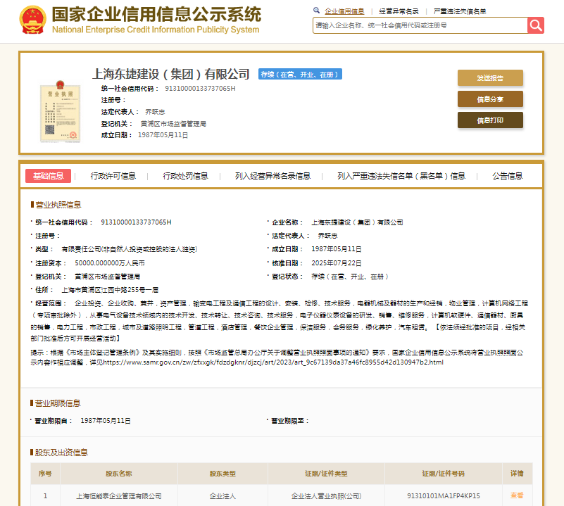 国家企业信用信息公示系统显示,上海东捷建设(集团)有限公司成立于1987年,注册资本50000万元人民币,法定代表人为乔跃忠,由上海恒能泰企业管理有限公司全资持股。
