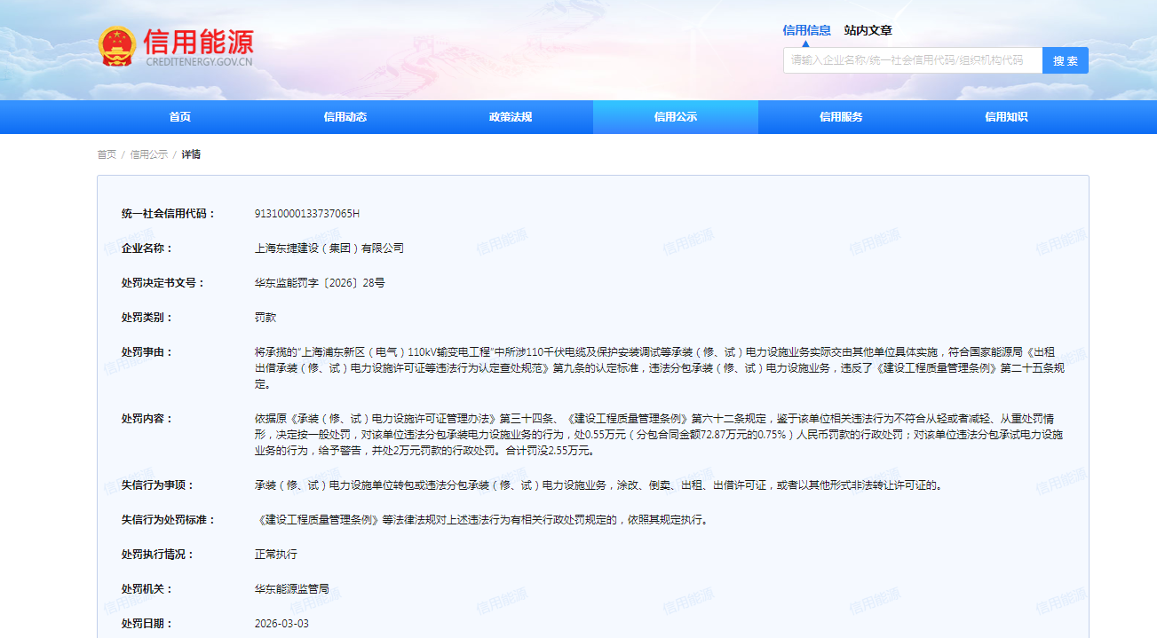 齐鲁晚报·齐鲁壹点记者于信用能源信用公示栏获悉,3月3日,上海东捷建设(集团)有限公司(下称“上海东捷建设”)及其子公司——上海新能凯博实业有限公司(下称“上海新能凯博实业”),因违反《建设工程质量管理条例》相关规定,同日收到华东能源监管局罚单。