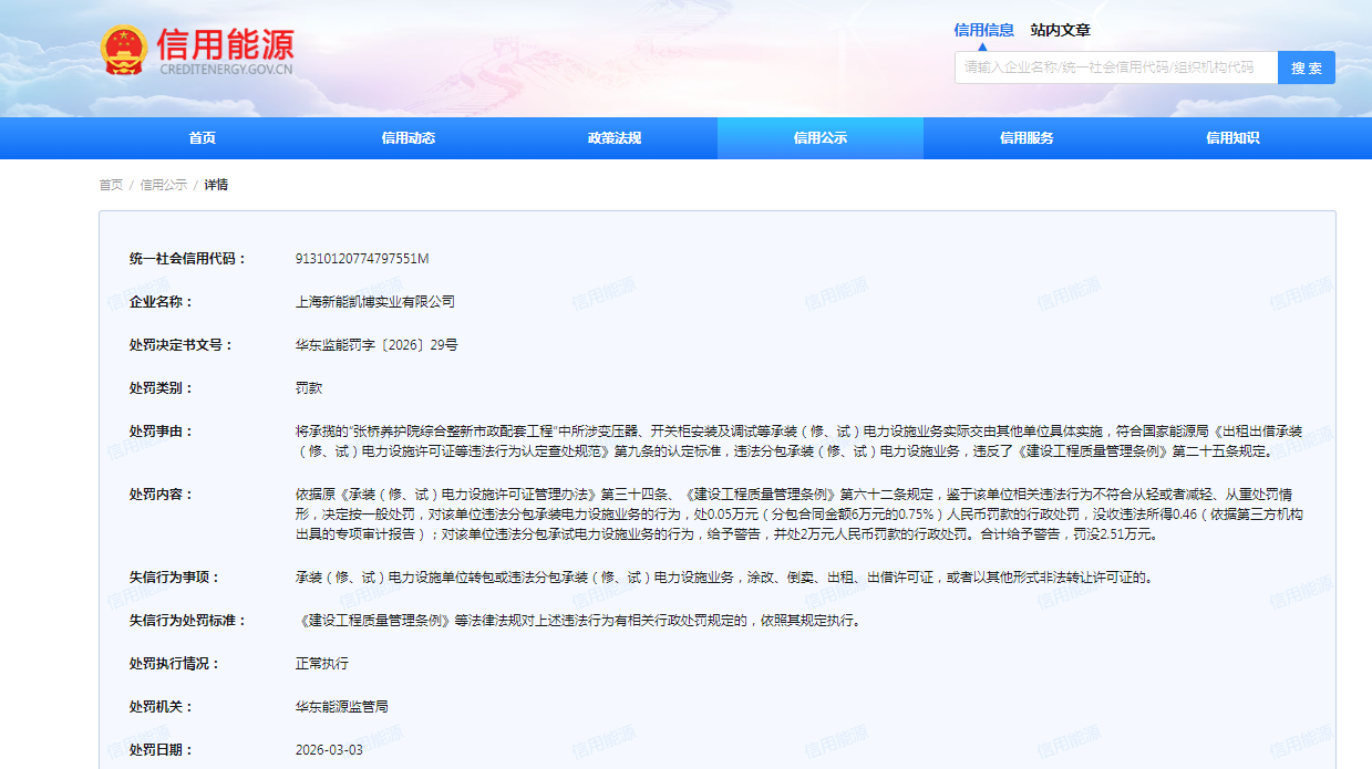 华东监能罚字〔2026〕29号则显示,上海新能凯博实业将承揽的“张桥养护院综合整新市政配套工程”中所涉变压器、开关柜安装及调试等承装(修、试)电力设施业务实际交由其他单位具体实施,符合国家能源局《出租出借承装(修、试)电力设施许可证等违法行为认定查处规范》第九条的认定标准,违法分包承装(修、试)电力设施业务,违反了《建设工程质量管理条例》第二十五条规定。