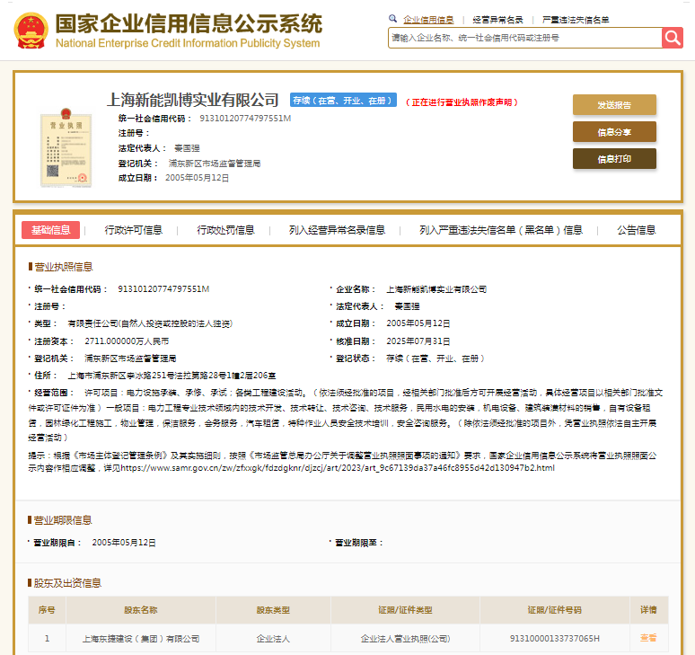 上海新能凯博实业有限公司则成立于2005年,注册资本50000万元人民币,法定代表人为秦国强,由上海东捷建设(集团)有限公司全资持股。