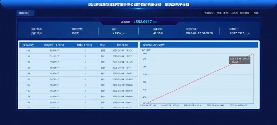 记者从山东产权集团获悉,近日,山东产权集团旗下山东产权交易中心与烟台联合产权交易服务有限公司(以下简称“烟台联合产权”)联合挂牌的两宗民营企业资产转让项目圆满收官。凭借省市平台协同联动优势与专业化服务,两宗资产在竞价环节高潮迭起,一宗底价397.09万元的设备类资产历经192轮激烈报价,最终以592.09万元成交,溢价率达49.1%;另一宗底价42.46万元的存货及设备类资产经46轮竞价,以60.46万元落槌,溢价率42.39%。