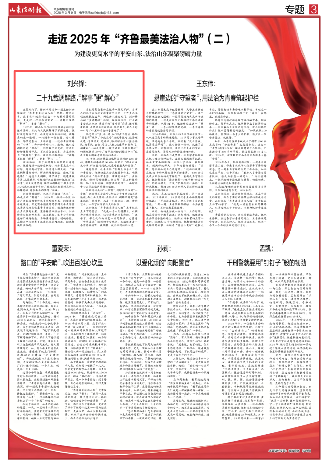 榜样如炬,照亮前行之路。山东法制报开设“走近2025年‘齐鲁最美法治人物’”专栏,集中刊发“齐鲁最美法治人物”先进事迹,深入讲述他们的感人故事,展现新时代法治工作者的精神风貌,激励全社会尊法学法守法用法,为建设更高水平的平安山东、法治山东凝聚磅礴力量。
