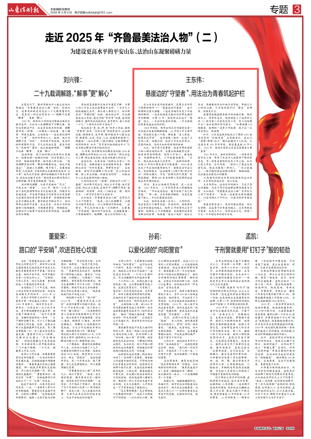 榜样如炬,照亮前行之路。山东法制报开设“走近2025年‘齐鲁最美法治人物’”专栏,集中刊发“齐鲁最美法治人物”先进事迹,深入讲述他们的感人故事,展现新时代法治工作者的精神风貌,激励全社会尊法学法守法用法,为建设更高水平的平安山东、法治山东凝聚磅礴力量。