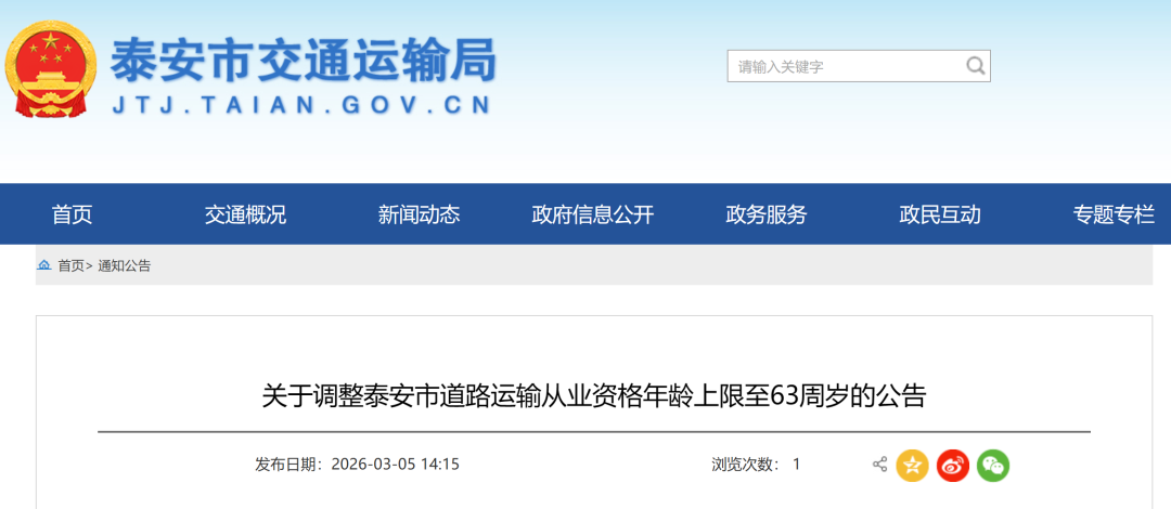 3月5日,泰安市交通运输局网站发布关于调整泰安市道路运输从业资格年龄上限至63周岁的公告,详情如下: