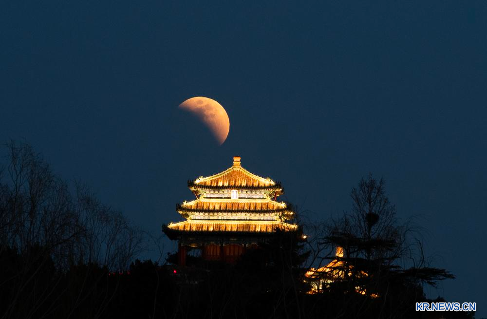[신화망 중국 베이징 3월8일] 지난 3일 베이징 징산(景山) 완춘팅(萬春亭) 위로 떠오른 개기월식.