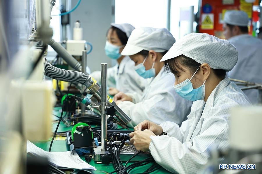 지난달 28일 광둥(廣東)성 둥관(東莞)시 셰순(協順)전자테크회사 생산라인에서 직원들이 작업을 하고 있다. (사진/신화통신)