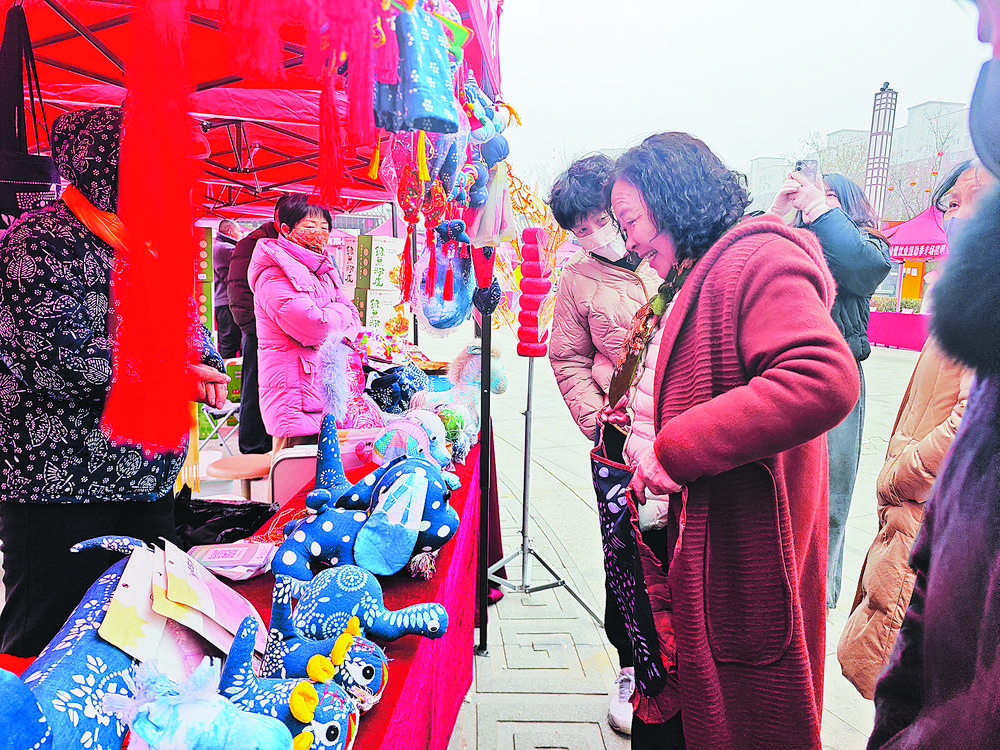 蓝印花布摊位前,该项目非遗传承人正在演示古老的印染技艺。一块白布几经浸染,绽放出青蓝相间的花纹。东明粮画的展台边,五谷杂粮在匠人指尖化作“花鸟鱼虫”,引得孩子们啧啧称奇。“这是用芝麻粘的麻雀!这是用绿豆贴的荷叶!”10岁的小观众刘子诺看得入了迷,拉着妈妈的手不肯离开。这些平日里藏在“深闺”的传统技艺,在元宵佳节集体亮相,让非遗不再是书本上的名词,而是可触可感的烟火日常。