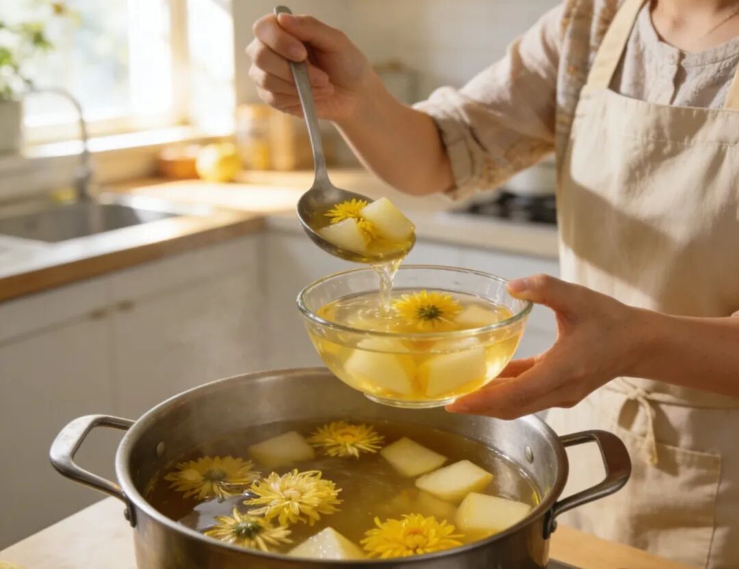 润燥款:菊花雪梨汤食材:菊花 6 朵、雪梨 1 个、冰糖适量做法:雪梨洗净去核,切成小块;锅中加适量清水,放入雪梨块煮 10 分钟,再加入菊花和冰糖,继续煮 5 分钟即可。功效:秋季干燥易上火,这款汤清甜滋润,能清热润肺、生津止渴,老人小孩都爱喝。