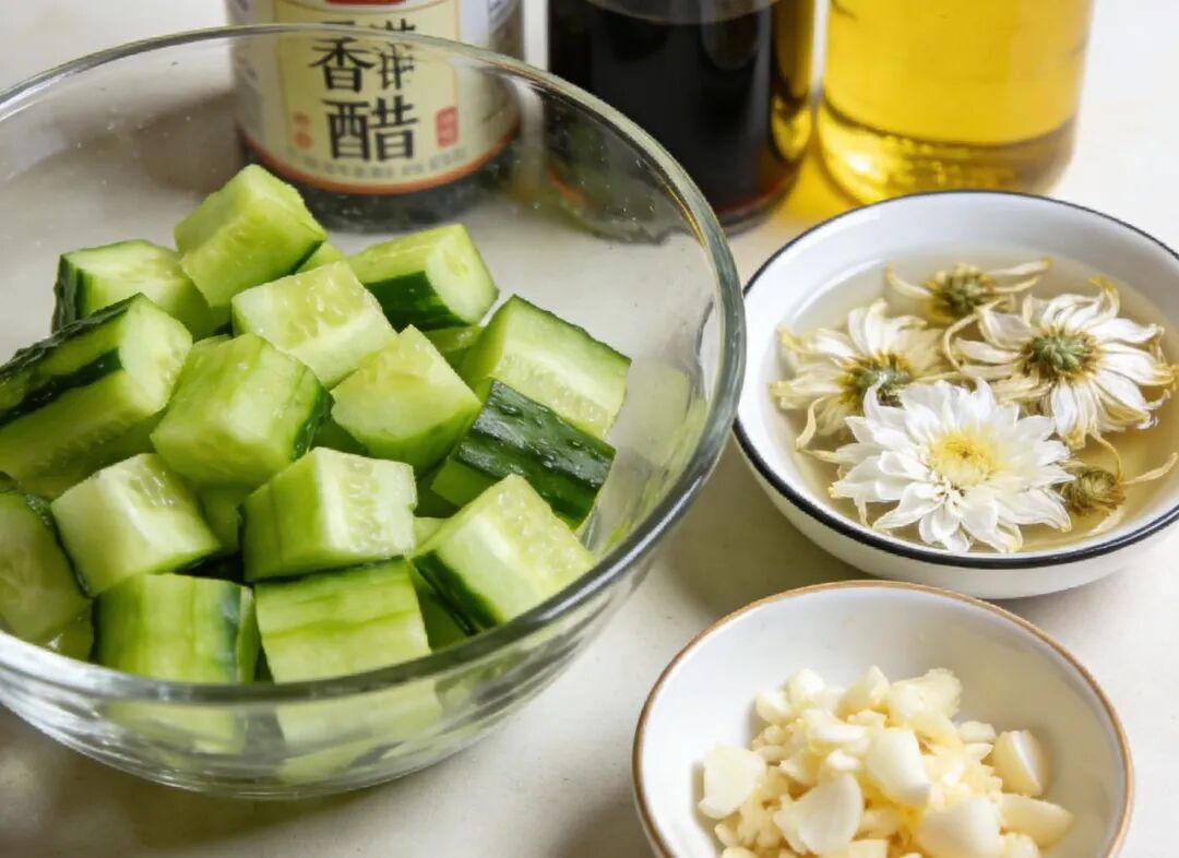 创新款:菊花凉拌黄瓜食材:干菊花 5 朵、黄瓜 1 根、蒜末、生抽、香醋、香油适量做法:干菊花用温水泡开,沥干水分;黄瓜洗净拍碎,放入碗中,加入菊花瓣、蒜末,淋上生抽、香醋,滴几滴香油,搅拌均匀即可。功效:清爽解腻,清热解暑,是夏季餐桌上的开胃小菜。