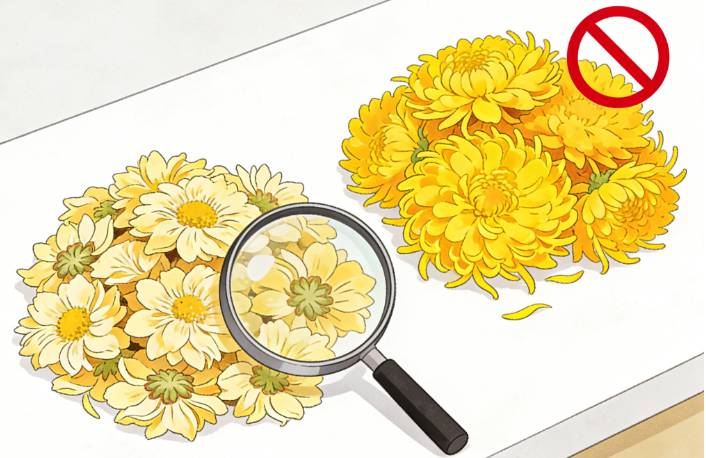 挑选菊花时,优先选择花瓣完整、颜色自然、无异味的干品,避免购买颜色过于鲜艳的菊花,可能经过硫磺熏制。