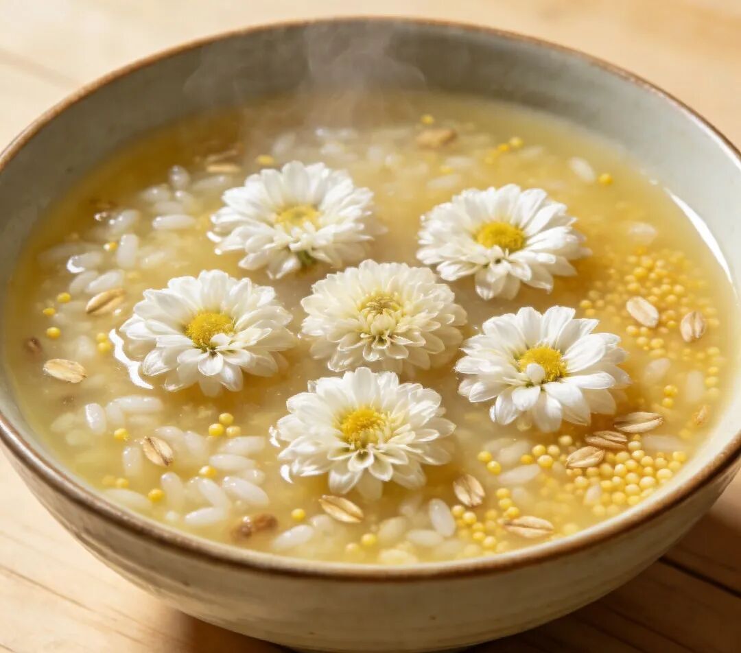 饱腹款:菊花杂粮粥食材:菊花 5 朵、大米 50g、小米 30g、燕麦片 20g做法:大米、小米淘洗干净,提前浸泡 30 分钟;锅中加足量清水烧开,放入杂粮煮至软烂,最后撒入菊花瓣,焖煮 3 分钟即可。功效:清淡养胃,适合早餐食用,既能补充膳食纤维,又能清热降火,开启元气满满的一天。