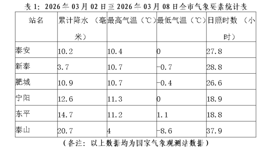 2026年03月02日~2026年03月08日,全市平均降水量10.4毫米;平均气温4.8℃,最低气温:-0.7℃,7日出现在新泰,最高气温11.3℃,8日出现在宁阳;平均日照时数24.2小时。各县(市)气象要素情况见表1.
