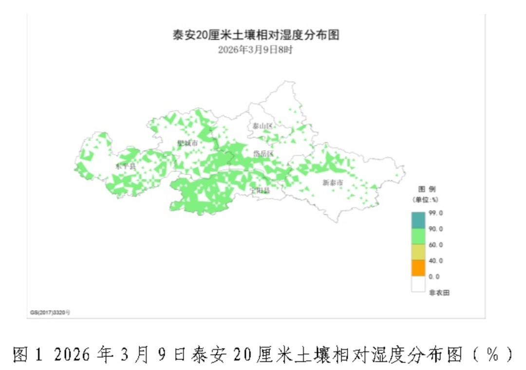 据2026年3月9日自动土壤水分监测网0~50cm资料显示,20cm土壤相对湿度介于67~90%之间,墒情适宜。各测站土壤墒情见图1.