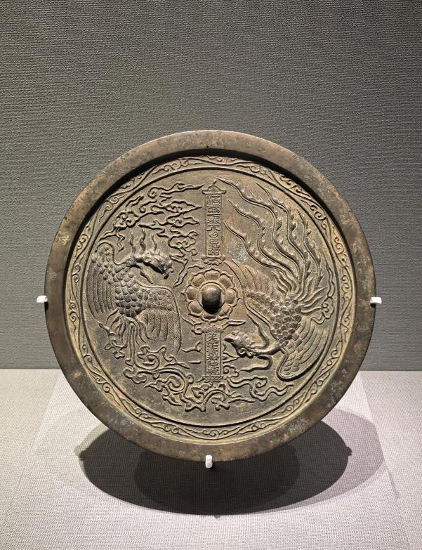 同墓出土的双凤莲花钮铜镜,则与朱元璋长女临安公主墓中的铜镜造型、纹饰高度相似,是明初朝廷为皇室女性定制的珍品。莲花为钮座,镜身刻有鸾凤相逐的图案,鸾凤展翅拖尾,卷云纹衬托其间,灵动飘逸。镜身竖刻两行铭文,上方篆书“洪武七年八月日造”,下方楷书“美字贰拾陆号”。专家推测“美字”编号是妃嫔专属标识,恰好契合戈妃的身份,印证了明初皇室器物的等级规制。铜镜敦厚体重,纹饰富硕,线条优美。