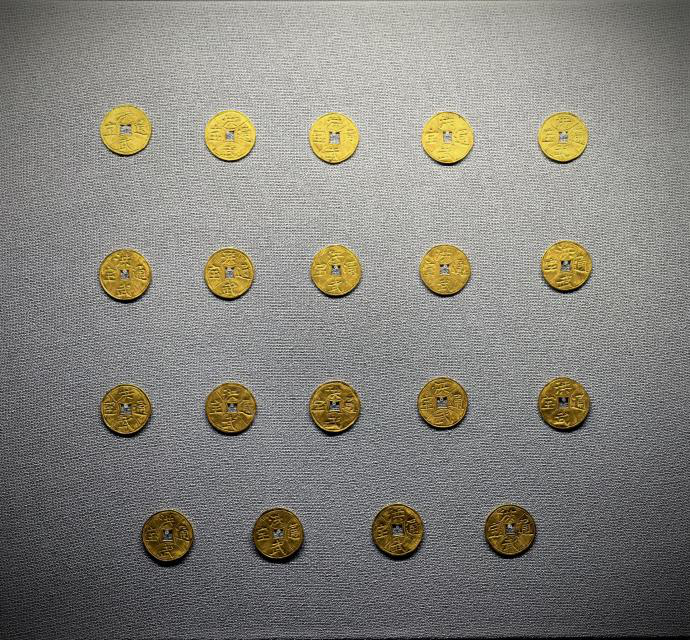 展柜里19枚光彩夺目的洪武通宝金币,总是引人驻足。数字“19”,隐喻着朱檀19岁的短暂一生。作为明代常见的随葬金银冥钱,出土时它们压在朱檀身下,是“垫背钱”的丧葬习俗,寓意为亡者在另一个世界准备“盘缠”,寄托着生者的祈福之意。纯金质地,正面手工錾刻楷书“洪武通宝”,虽非流通货币,却反映出明初亲王的丧葬规格与工艺水平。