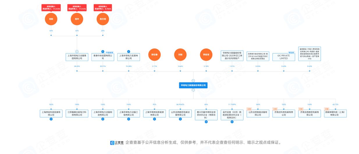 企查查显示,华明装备的股权结构中,上海华明电力设备集团有限公司持股为28.25%,香港中央结算有限公司持股为20.91%,上海华明电力发展有限公司持股为15.28%,郭伯春持股为2.71%,刘毅持股为2.66%。