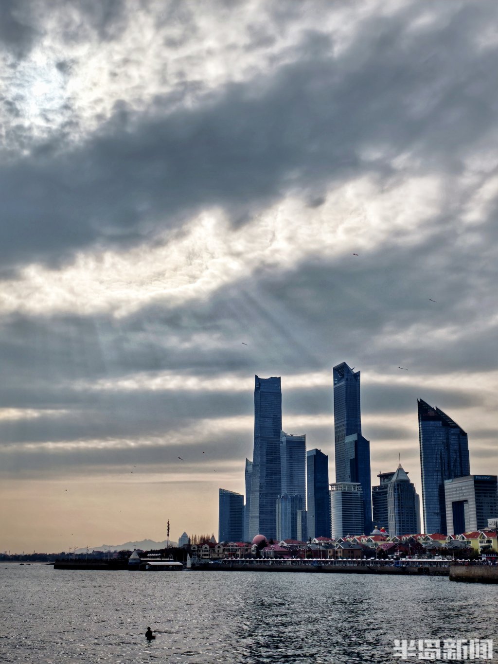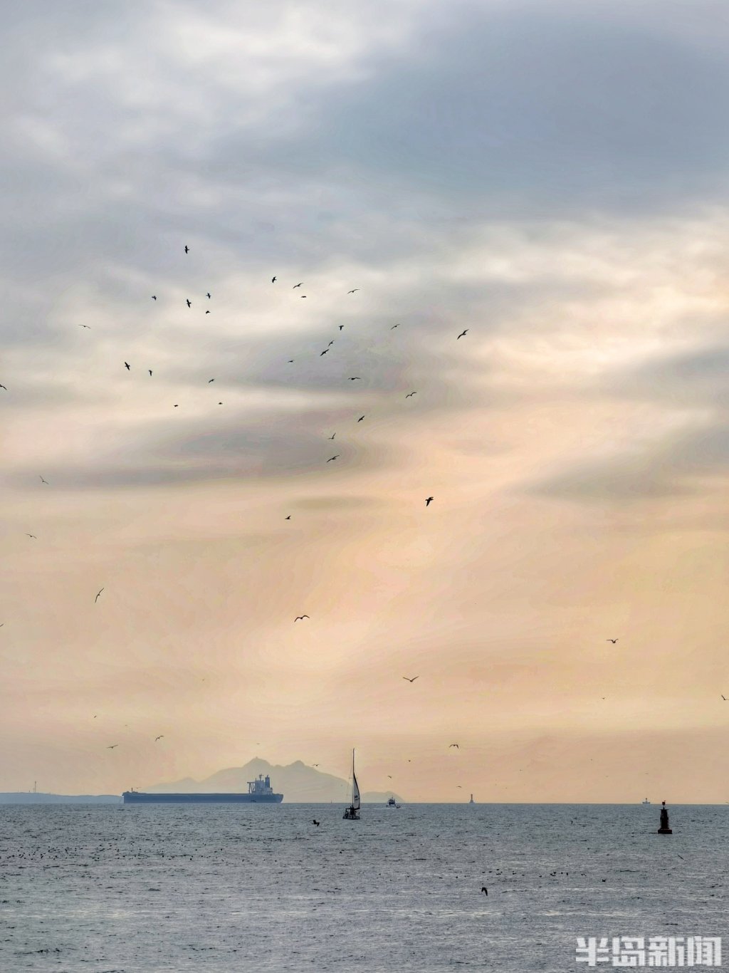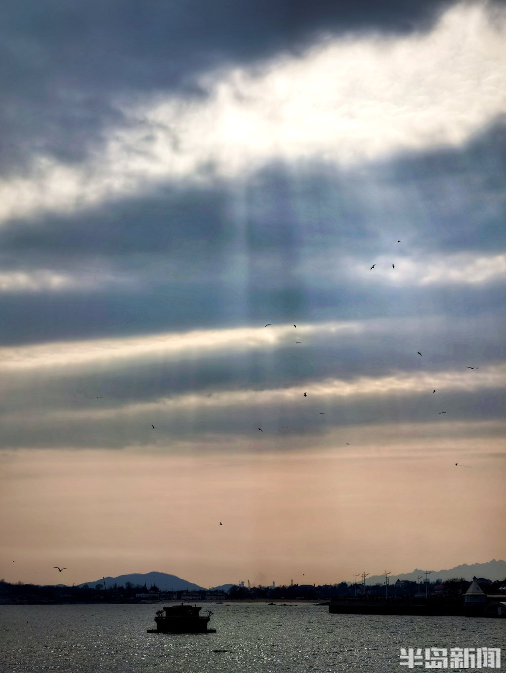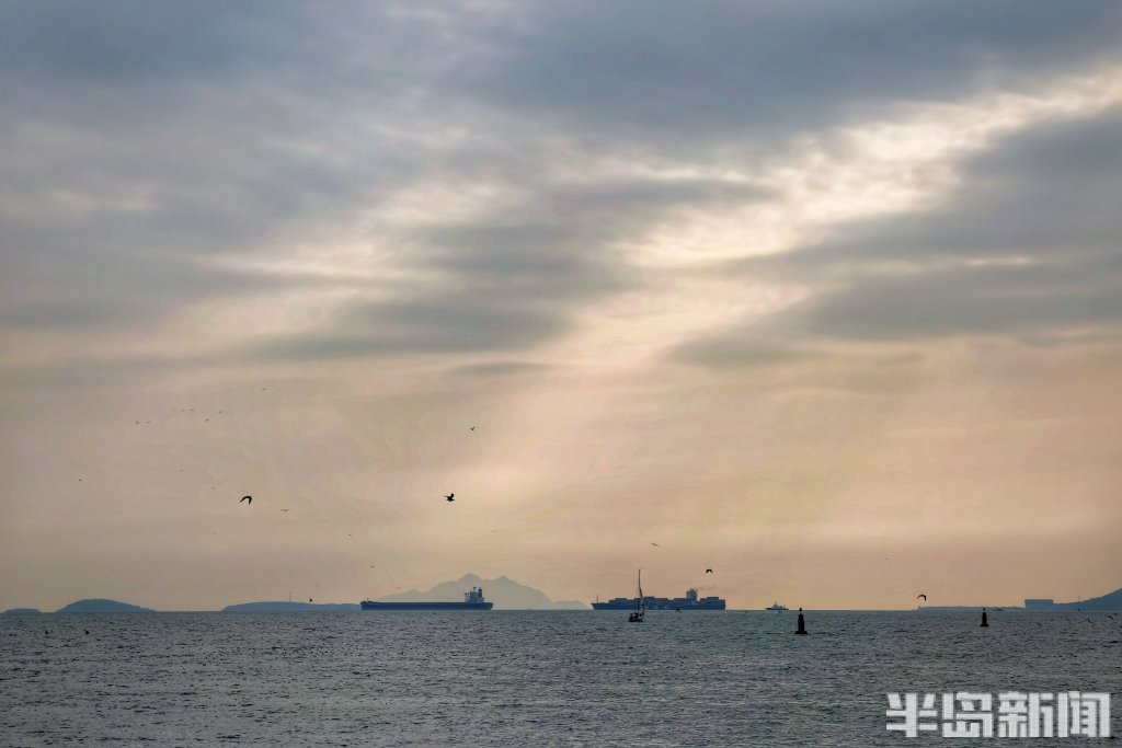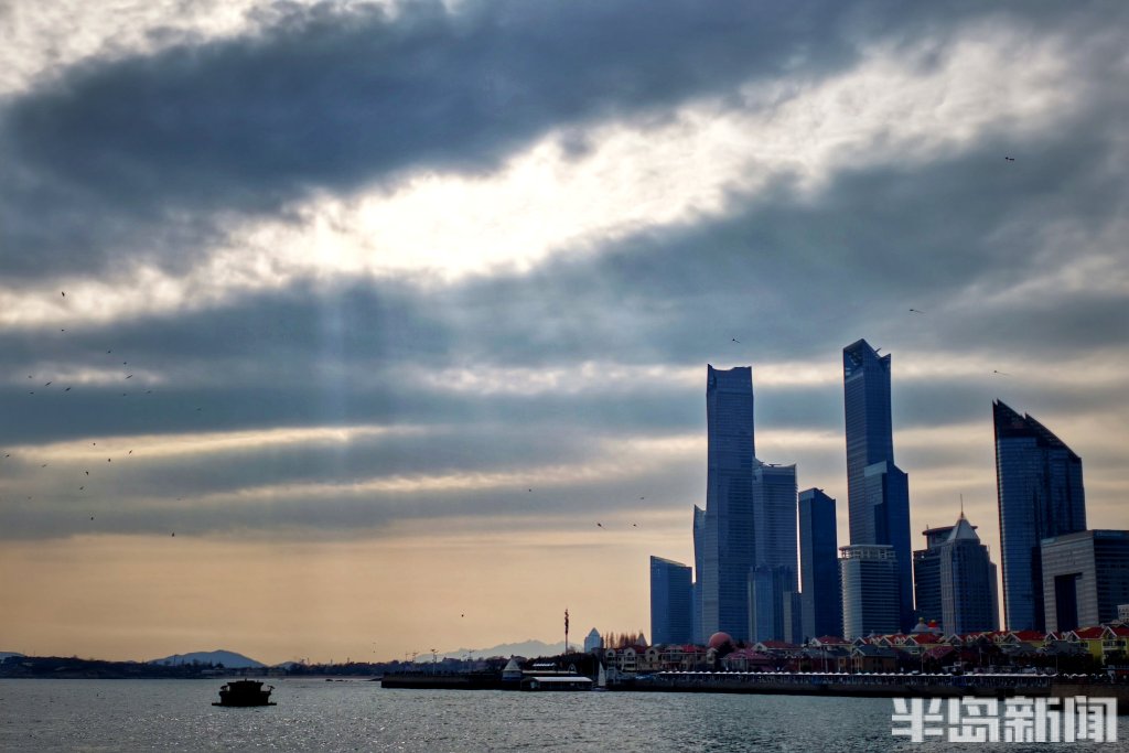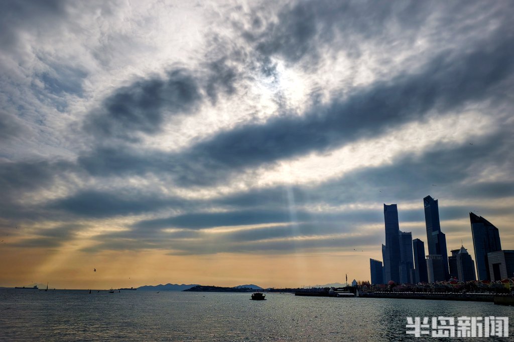 3月8日下午,青岛近海海域上空上演了一场光影变幻的视觉盛宴。浓密的云层间,一道道金色的光束穿透云隙倾泻而下,在海面上铺展开来,形成壮观的“云层漏光”景象。在五四广场、奥帆中心等沿海一线,不少市民游客被这难得的天象吸引,纷纷举起手机记录。夕阳西下时,漏光愈发浓郁,金色的光束与远处归航的渔船剪影相映成趣,为初春的青岛海滨增添了一份流动的诗意。(半岛全媒体记者吴璟)