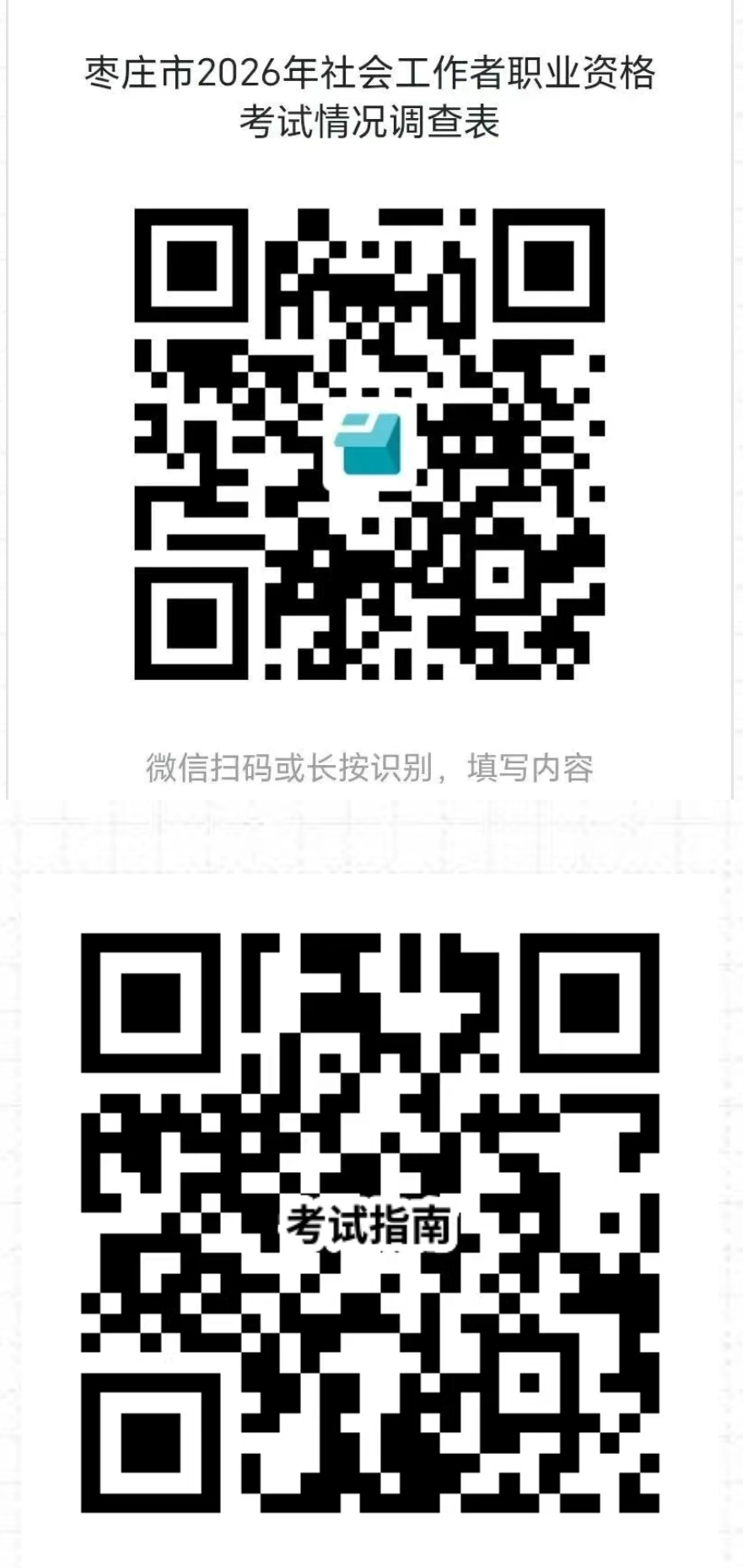 社会工作者职业崇高且责任重大,是适应经济社会发展和城市化进程的迫切需求,更是基层社会治理中不可或缺的重要力量。热爱社会工作事业、富有社会责任感的各界人士,要勇于担当、主动作为,积极报名参加2026年全国社会工作者职业资格考试,以考试为契机夯实专业基础,进一步拓宽个人职业发展空间。希望大家能够科学运用专业社会工作理论、知识、方法和技能,积极参与基层社会治理,为弱势群体提供精准关爱与专业帮助,在服务社会、奉献他人的过程中实现自我价值,为构建和谐社会贡献坚实力量。各有关单位要高度重视社会工作专业人员队伍建设,广泛开展宣传动员,积极为报考人员提供备考支持,全面保障社会工作者的合法权益,以专业人才队伍建设助推社会基层治理水平提升、促进社会和谐稳定。枣庄市委社会工作部将竭诚为社会各界报考人员提供政策咨询、考前指导等服务(咨询电话:8125856)。请及时关注中国人事考试网和“枣庄社会工作”微信公众号发布的考试有关资讯、免费培训课程及题库。