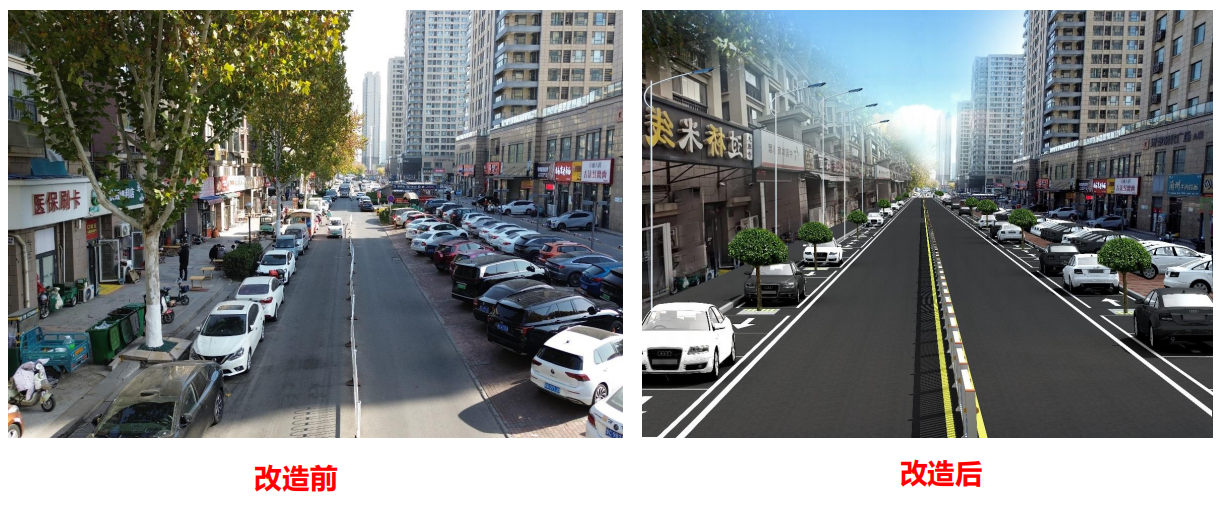 针对这些问题,改造方案提出了一系列具体措施:车行道两侧将各拓宽2.5米,并施划路侧停车位,以满足日益增长的停车需求;店前区域将翻建为沥青铺装,并清除现有绿化,统一台阶风格,改种石楠树以增加店铺营业通透性;同时,将增设污水支管,确保所有商铺污水接入市政污水管道,并对错接的雨水口连接管进行改造;此外,还将新建路灯管线,采用单悬臂LED路灯提高夜间行车安全性,并预留智慧停车管线以备未来升级。