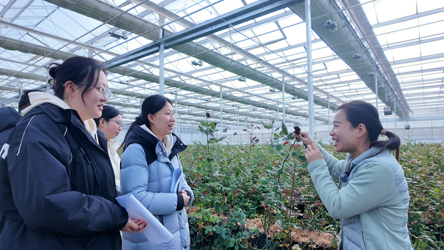 二月下旬,乍暖还寒。作为“千村行动”寒假社会实践专项调查活动的一部分,山东科技大学交通学院“淄”源新探,青山践履实践团走进淄博市淄川区大奎山,探访一座正在废弃矿坑上生长的“花能互补”智能温室产业基地。站在基地的观景平台上,脚下曾是煤灰飞扬的矿坑,眼前却是12万株玫瑰在智能温室内静静绽放,静得仿佛能听见春天破土的声音。