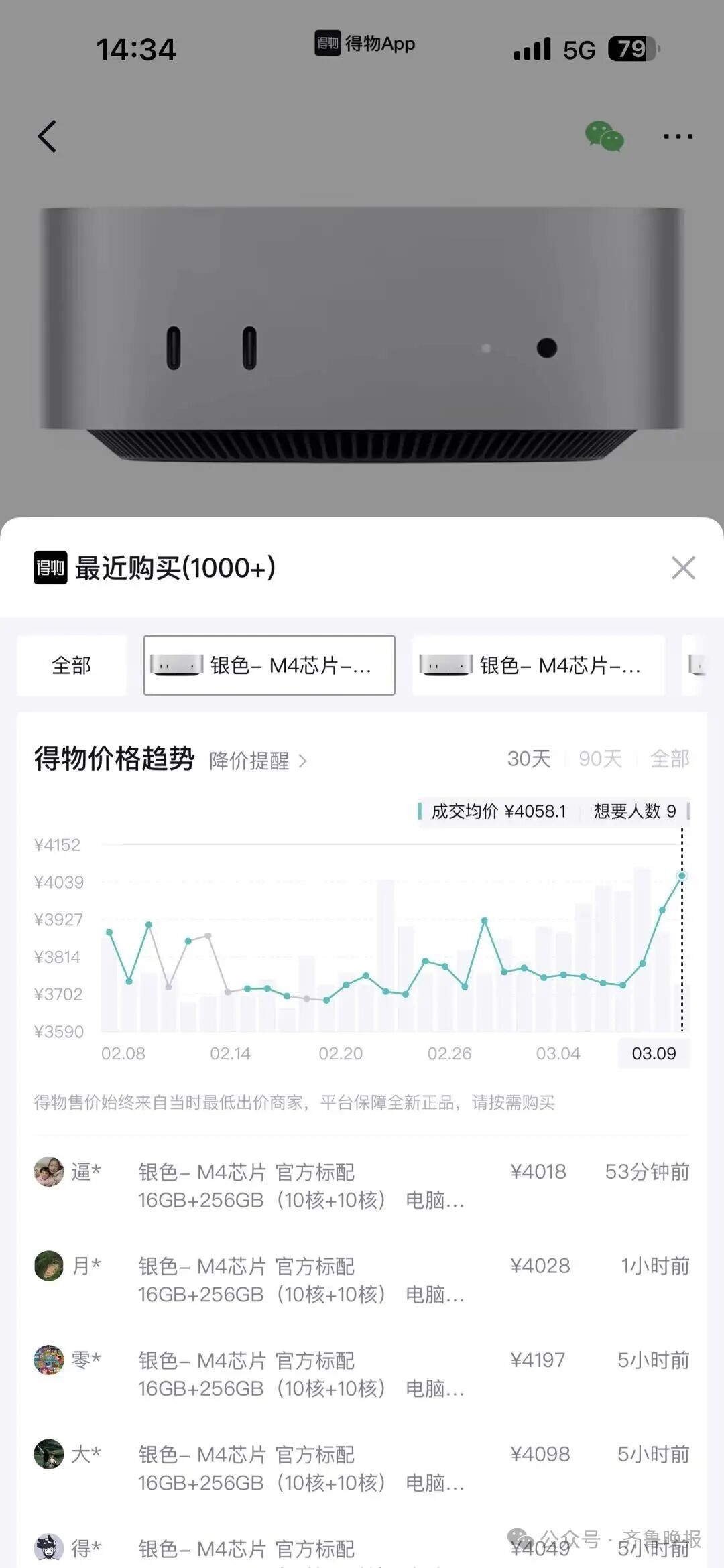 据得物App数据显示,Mac Mini M4主机多个型号已售罄,最近一周Mac mini M4价格最高增长649元(13%)。