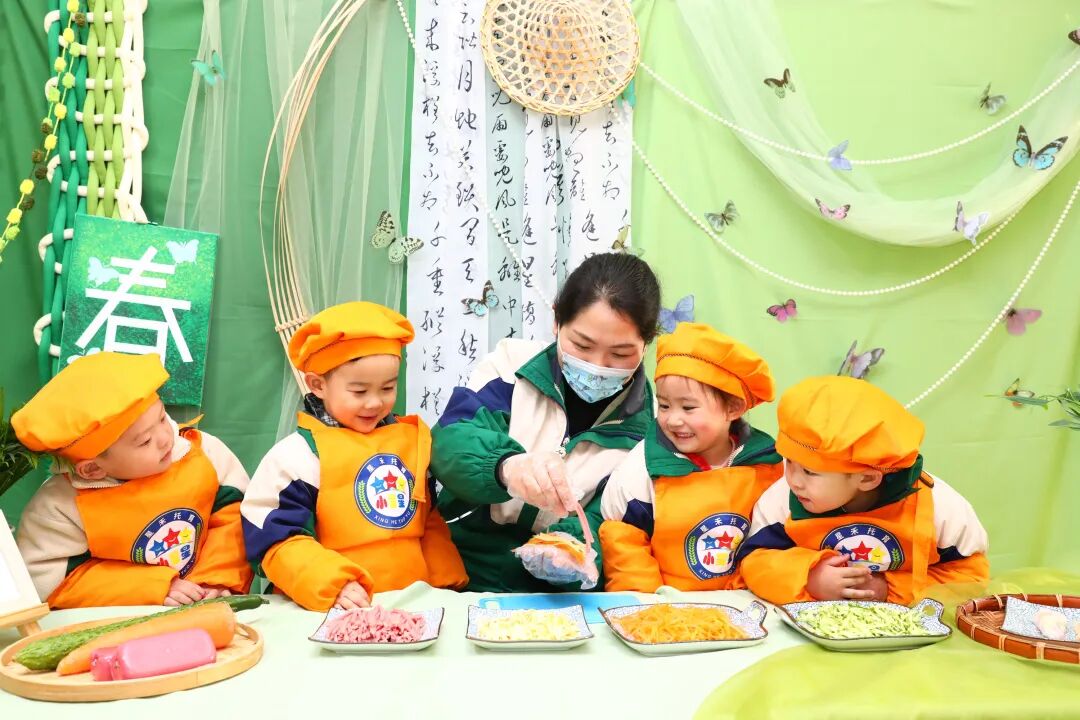 2月3日,江苏海安市一家托育中心里,孩子们在老师指导下学包春卷。顾彬斌摄