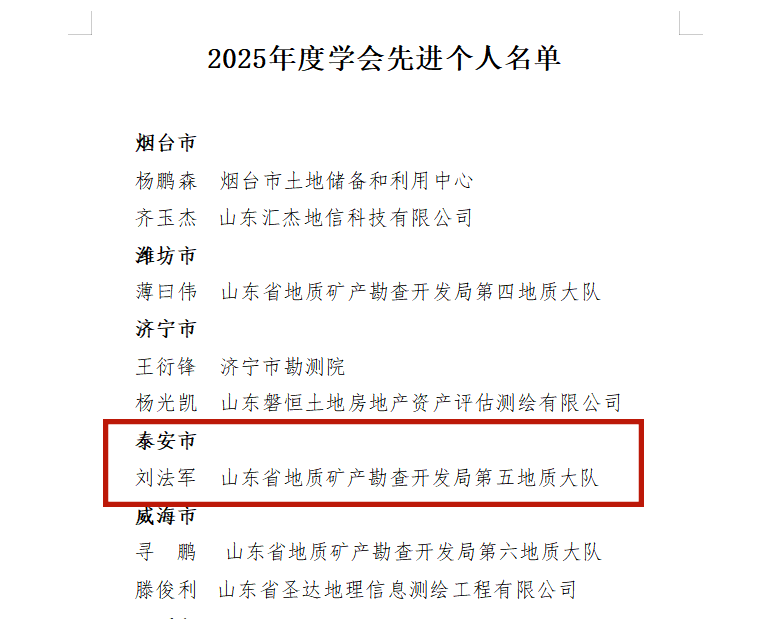 近日,山东省测绘地理信息学会发布2025年度表彰通报,省地矿局五队获评先进集体,刘法军获评先进个人荣誉称号。