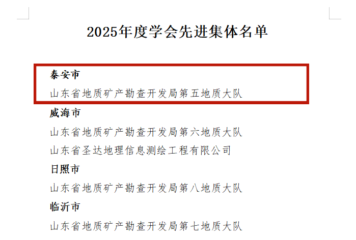 山东省地矿局五队获评山东省测绘地理信息学会2025年度先进集体与先进个人