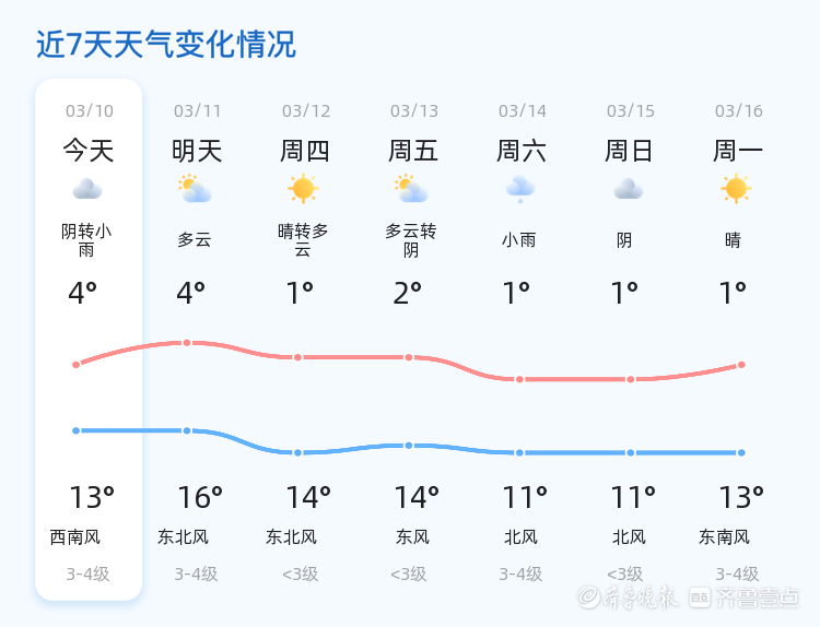 未来三天,临沂市天气将以多云、阴天为主,周三(3月12日)多云转阴,周四(3月13日)小雨,周五(3月14日)阴,周六(3月15日)阴,周日(3月16日)晴。气温波动较大,最高气温16℃,最低气温1℃。市民需根据天气变化及时增减衣物,特别是雨天出行时,注意防滑。