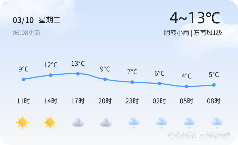 今天是3月10日,星期二,农历正月廿二。临沂市今日天气阴转小雨,气温介于4℃至13℃之间,东南风1级。目前气温为2.2℃,空气湿度为66%,PM2.5指数为106,属于轻度污染。全市各区天气情况基本一致,均以阴转小雨为主。