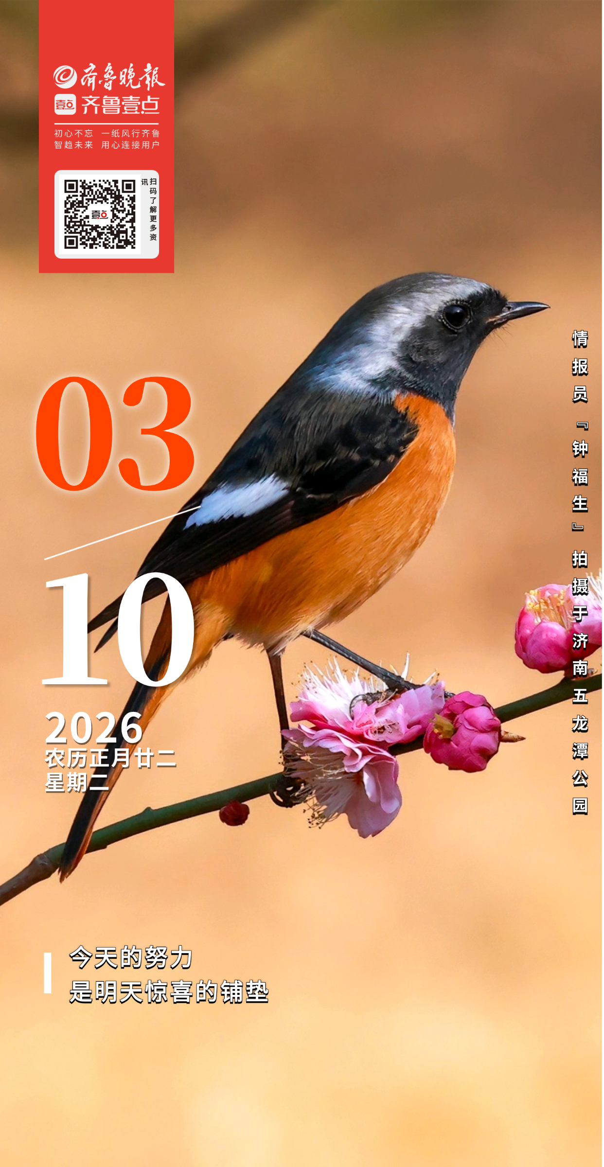 初春时节,济南五龙潭公园春意盎然,春梅、迎春、早樱相继绽放,争奇斗艳。北红尾鸲雄鸟羽色明艳,穿梭于花枝、矮树与泉边石间。鸟与花相映成趣,引得众多摄影爱好者纷至沓来,捕捉精彩瞬间。
