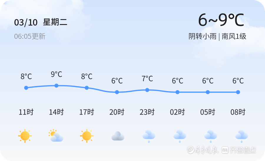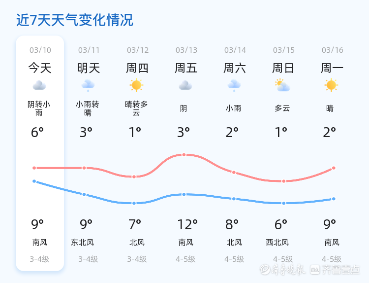 今天是3月10日,星期二,农历正月廿二。威海市今日天气为阴转小雨,气温介于6℃至9℃之间,南风1级。各区天气情况总体平稳,但局部地区可能出现小雨,市民出行请注意携带雨具。明日天气与今日相比有所变化,预计明日为小雨转晴,气温维持在3℃至9℃之间,风力逐渐增强至东北风3-4级。市民需关注天气变化,及时调整衣物,防范降雨带来的道路湿滑情况。未来三天,威海市天气趋势呈现多变特点。周三至周五期间,天气以晴转多云为主,气温将降至1℃至7℃,局部地区可能出现阴天和小雨天气。特别提醒市民,近期风力较大,外出时需注意防范大风对出行的影响,确保人身安全。温馨提示