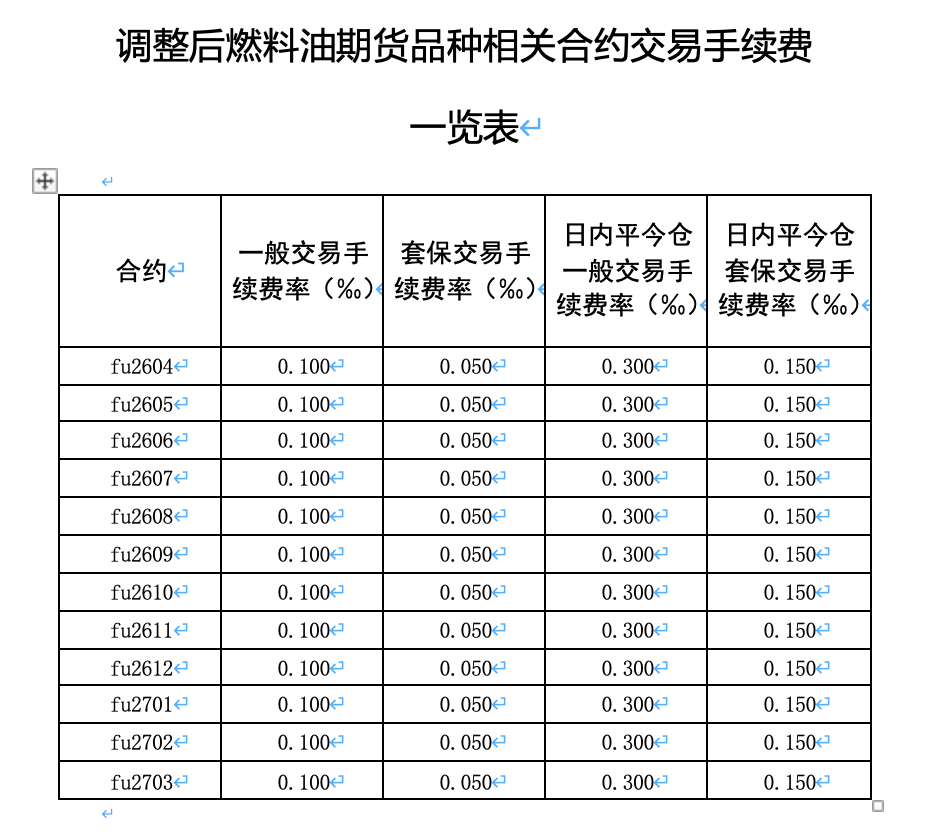 根据最新安排,自2026年3月11日交易(即3月10日晚夜盘)起,燃料油期货已上市合约交易手续费调整为成交金额的万分之一,日内平今仓交易手续费调整为成交金额的万分之三。原油期货已上市合约交易手续费调整为40元/手,日内平今仓交易手续费调整为240元/手。低硫燃料油期货已上市合约交易手续费调整为成交金额的万分之一,日内平今仓交易手续费调整为成交金额的万分之三。