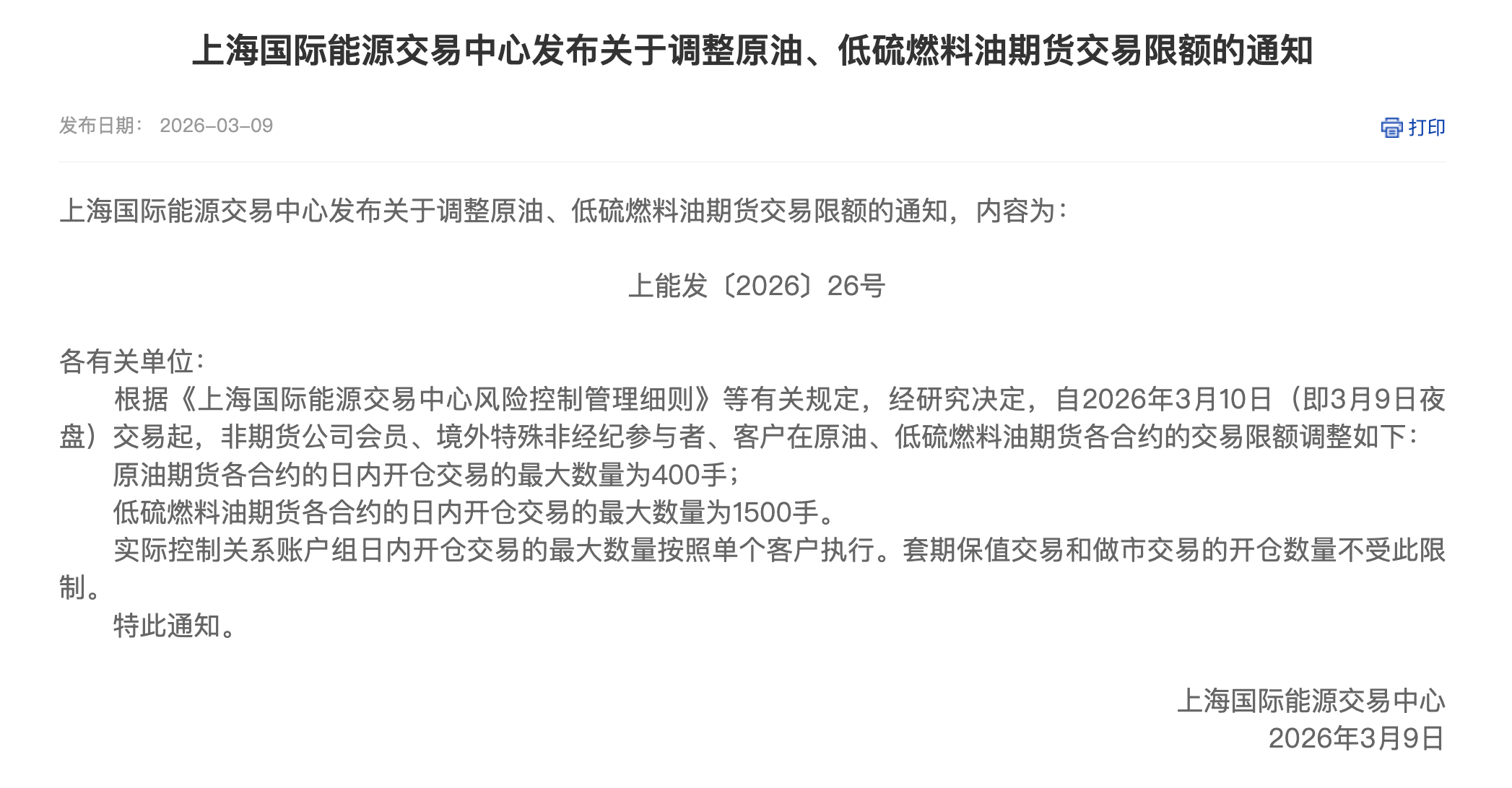 此外,上期能源表示,自2026年3月10日(即3月9日夜盘)交易起,非期货公司会员、境外特殊非经纪参与者、客户在原油期货各合约的日内开仓交易的最大数量为400手;低硫燃料油期货各合约的日内开仓交易的最大数量为1500手。