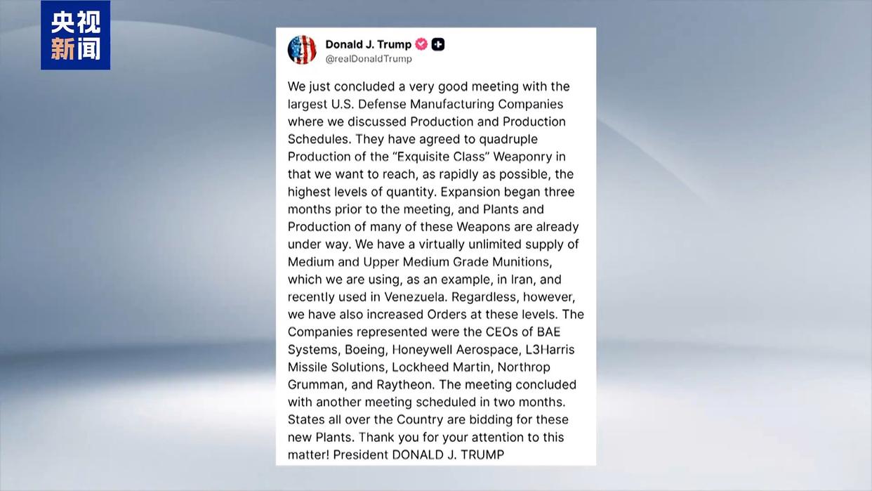 美国总统特朗普6日在社交媒体发文称,已与波音、洛克希德- 马丁、诺思罗普- 格鲁曼等美国军工巨头召开会议,商讨提升武器产量事宜。特朗普称,与会企业已经同意增加产量,目前多款武器的生产线已全面投产。