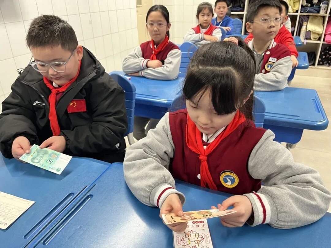 趣味点钞比赛环节点燃了同学们的参与热情,大家手持练功券,专注计数、指尖翻飞,在速度与精准的比拼中,不仅锻炼了专注力和动手能力,更增强了规则意识。此外,工作人员还结合货币演变历史,简要讲解了从原始贝壳货币到现代纸币的起源与发展,让同学们了解货币文化,引导其从小养成勤俭节约、诚信用币、理性消费的良好习惯,全面提升综合素养与文明意识。