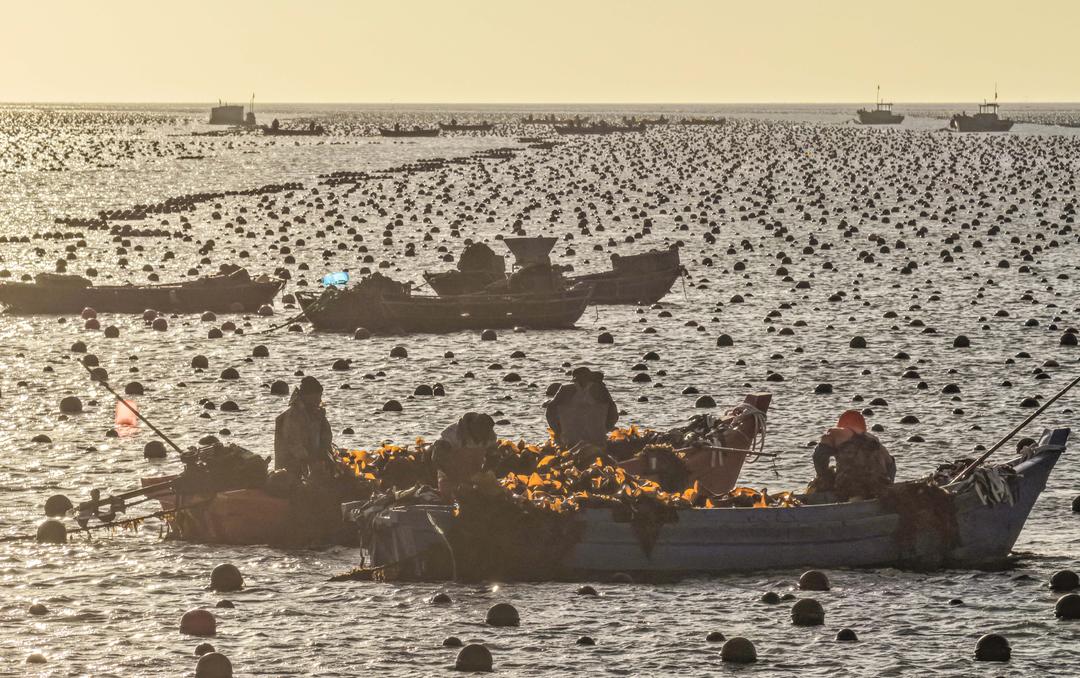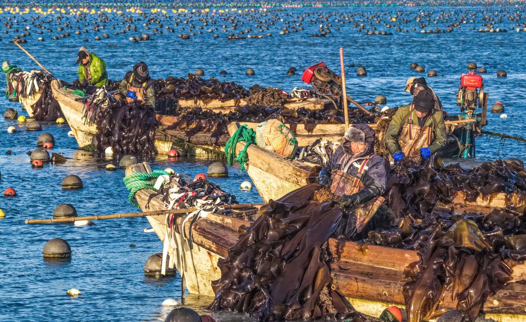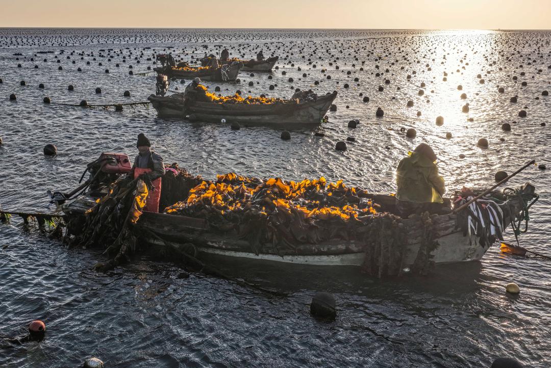 3月9日,在荣成市爱伦湾海洋牧场海带养殖区,养殖户对近岸养殖区达到成熟标准的海带分批及时收割,为后期收割的海带留出生长空间,以便提高海带的产量和质量。由于去年海带播种时间提前,荣成海带收获作业较往年提前二十多天。荣成是我国海带主产区。2025年,荣成全市海带养殖面积18万亩,海带养殖产量50.84万吨,占全国的40%、山东省80%以上。(李钟芸李信君)
